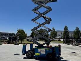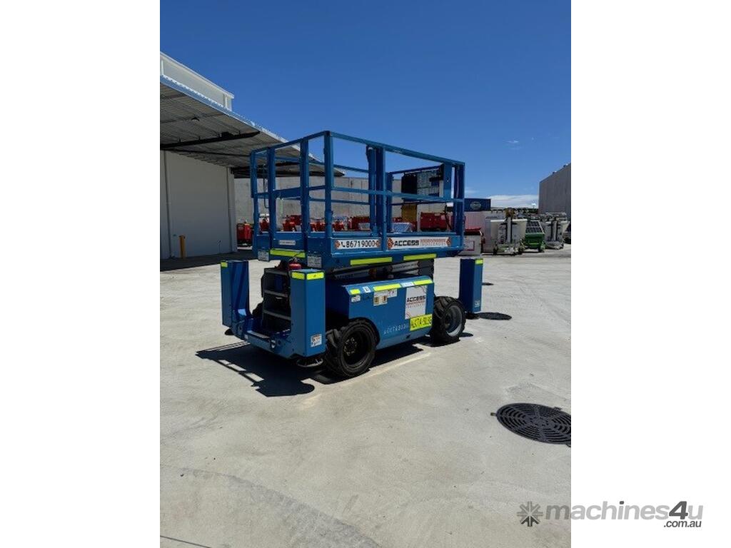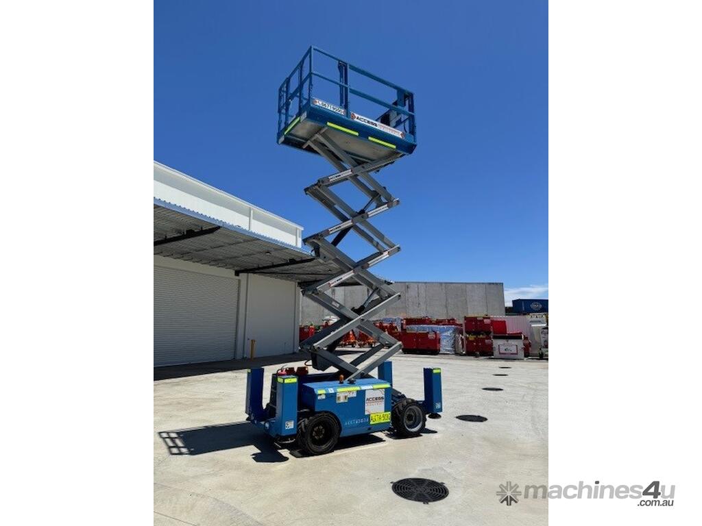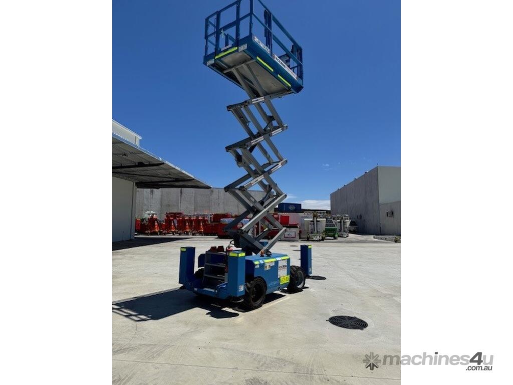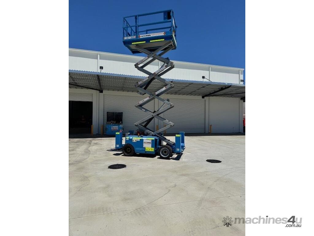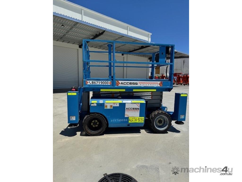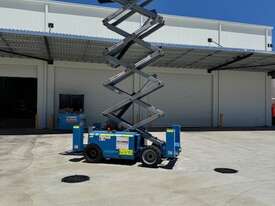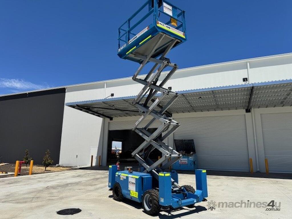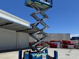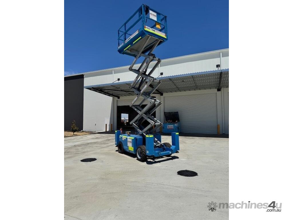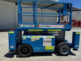 The Genie GS-3268 RT is a 38ft rough-terrain scissor lift built for outdoor construction, installation, and maintenance work. It delivers a working height of 38ft (11.51m), platform height of 32ft (9.75m), and a 454kg lift capacity. The wide 1.55m platform with a 1.52m roll-out deck extension provides extra workspace. With 4WD, 25 percent gradeability, and dual front-wheel drive, the GS-3268 RT offers solid traction on uneven ground.