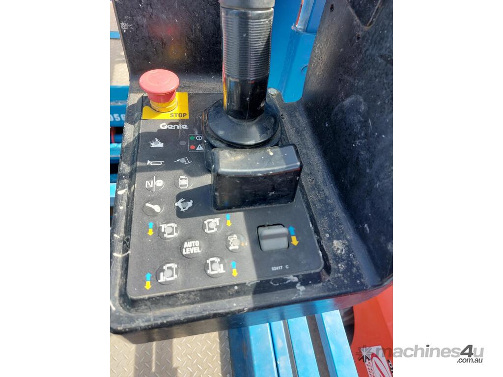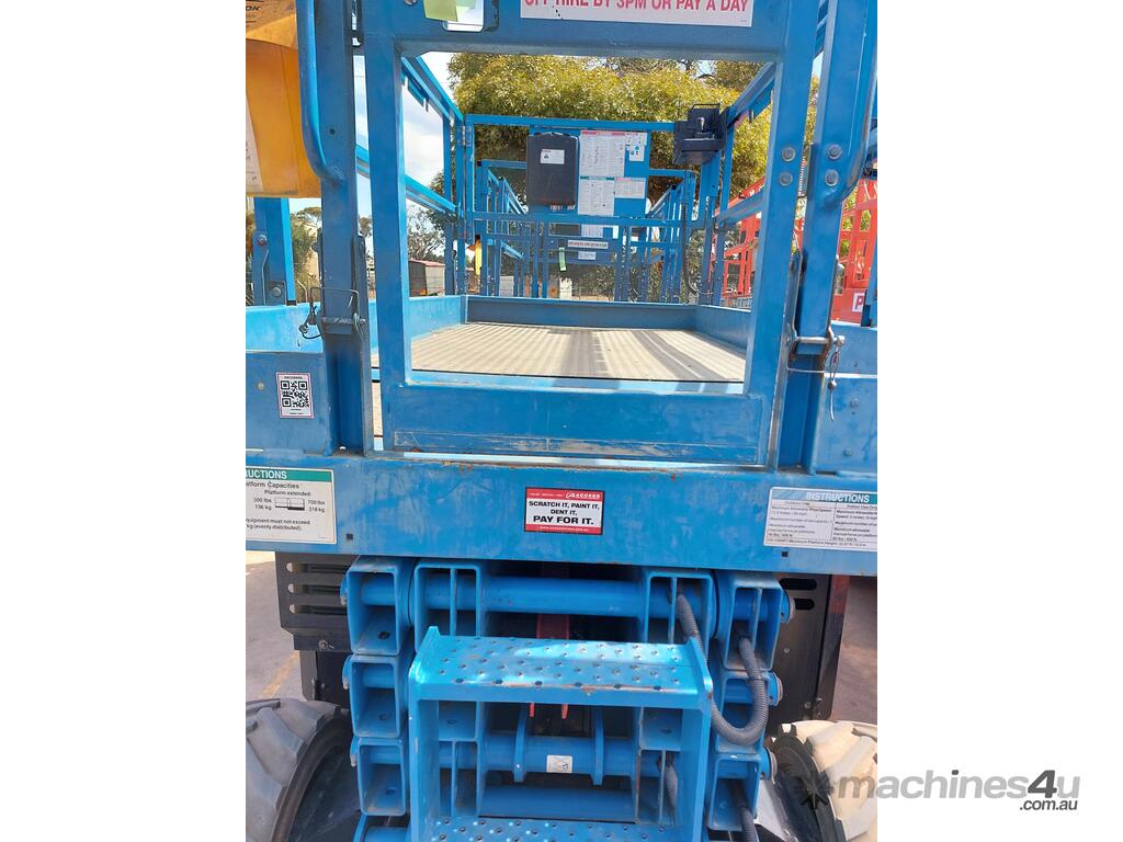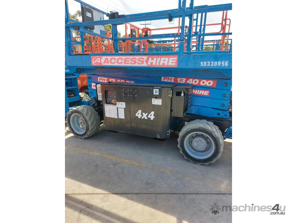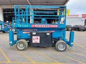 The Genie GS-3369 RT is a reliable diesel rough terrain scissor lift built for outdoor worksites that need stable elevated access. It offers a 9.96 m platform height for a working height of 11.96 m with a large 2.79 m by 1.6 m deck and a 1.52 m extension for extra reach. The machine handles uneven ground with four-wheel drive positive traction control and automatic outriggers. With a 454 kg lift capacity and wide platform it suits trades that need room for people and tools. Foam-filled rough terrain tyres improve stability and reduce downtime. The GS-3369 RT is a strong choice for construction maintenance and installation work outdoors.