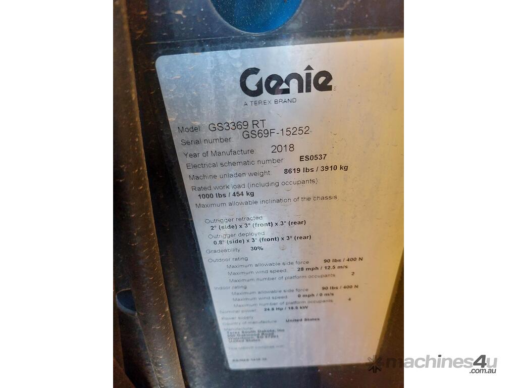 "The Genie GS3369RT, located in Adelaide, is a 5-year-old compact rough terrain scissor lift with a platform height of 33ft (10.06m). It is ideal for outdoor applications where stability, traction, and high platform capacity are essential. It provides a safe and efficient solution for elevated work in construction, maintenance, and industrial projects on challenging terrain.