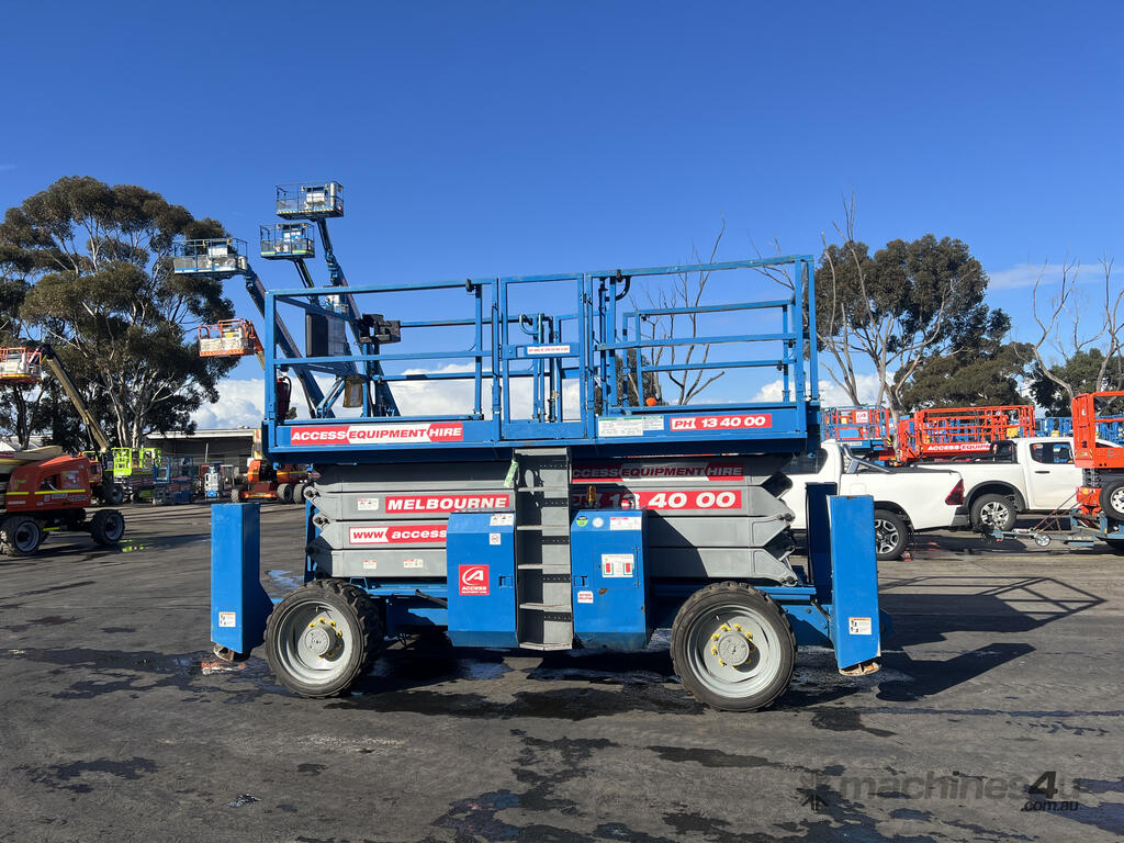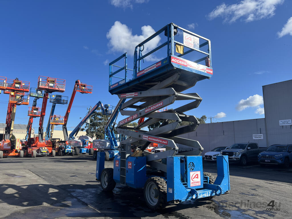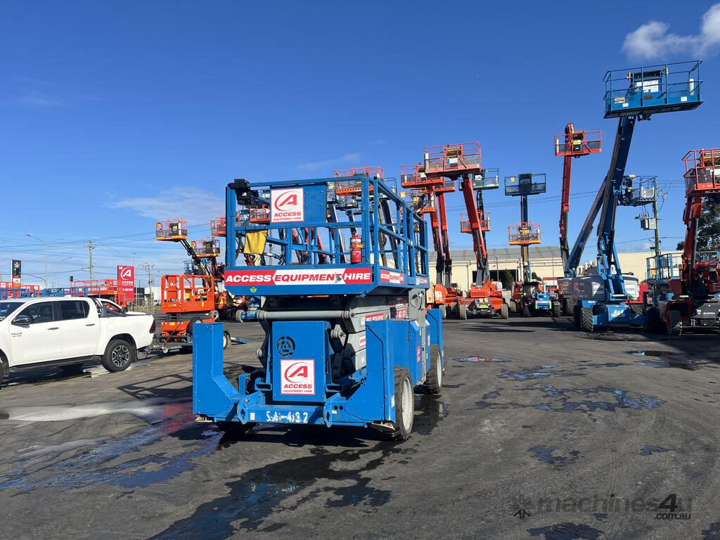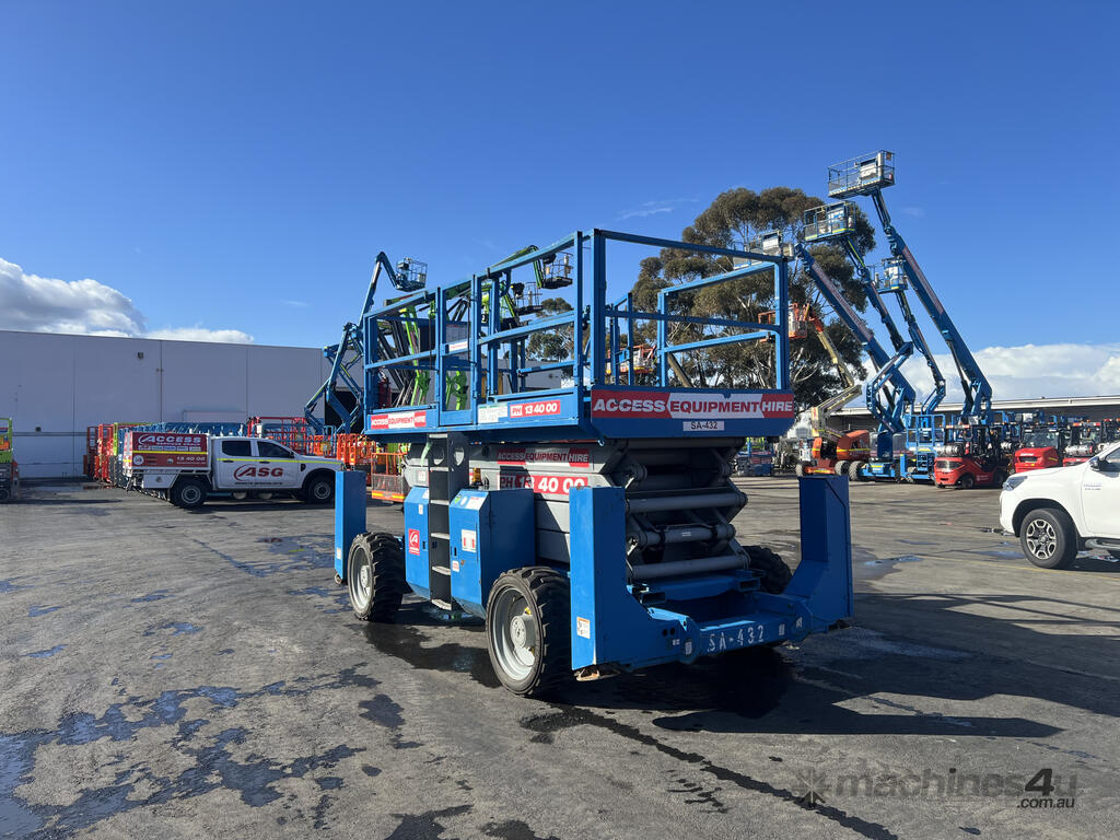 The Genie GS4390RT is a rugged 43 ft diesel scissor lift designed for demanding outdoor worksites. With a platform height of 43 ft (13.11 m) and a working height of 49 ft (15.11 m), it delivers an impressive 680 kg lift capacity, accommodating up to 7 occupants. This unit comes equipped with a full-time 4WD system, automatic hydraulic outriggers, and dual slide-out platform extensions (5 ft front, 4 ft rear) for added reach and workspace. Powered by a 48 hp Deutz D2011L03i diesel engine, the GS4390RT is engineered for productivity, stability, and reliable performance on uneven terrain.
