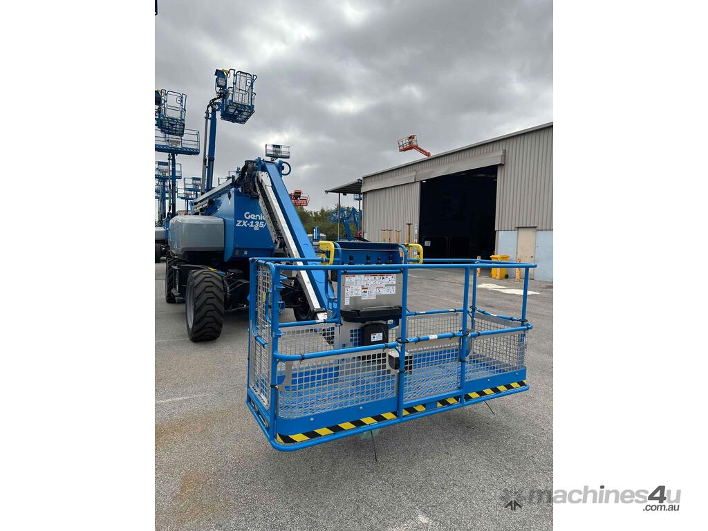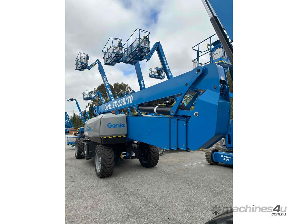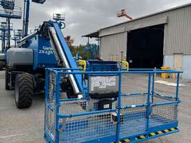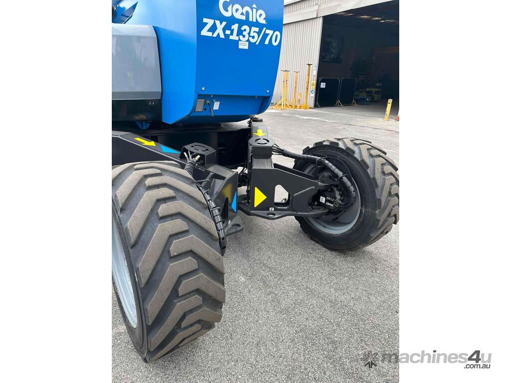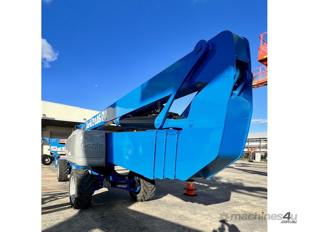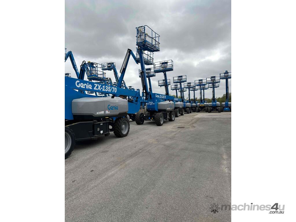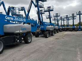 The Genie ZX-135/70 is a high-reach articulating boom lift built for tough elevated work where long outreach and strong up-and-over access are essential. It delivers a maximum working height of 43.15m, a horizontal reach of 21.26m, and an impressive up-and-over clearance of 23.01m, making it ideal for construction maintenance and industrial use. The lift supports 272kg, giving room for two workers and tools. Its extendable axles improve stability on uneven ground and the rough-terrain foam-filled tyres support smooth operation outdoors. With four-wheel drive and four-wheel steer the ZX-135/70 performs well in tight or sloped areas while the diesel engine offers steady reliable power. A 2.44m platform with 160° rotation and a 110° vertical jib gives operators more precise positioning for overhead tasks.