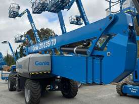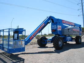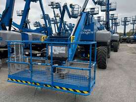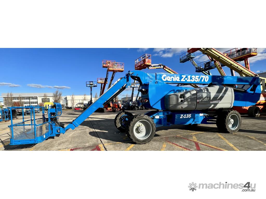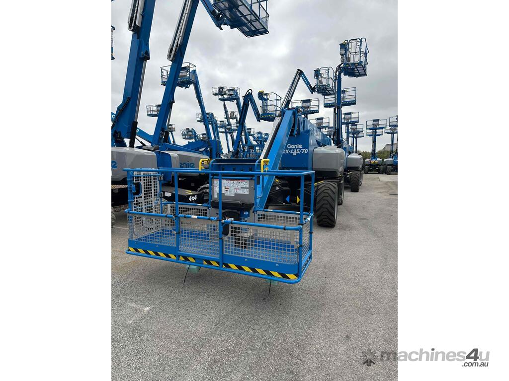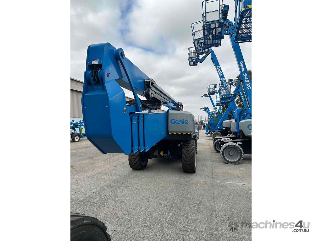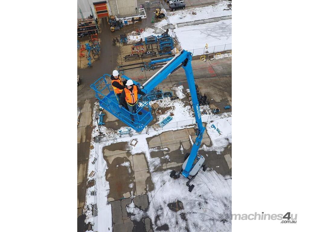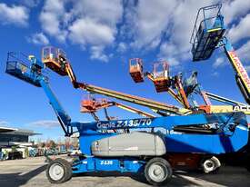The Genie ZX-135/70 is a high-reach articulating boom lift built for tough elevated work where long outreach and strong up-and-over access are essential. It delivers a maximum working height of 43.15m, a horizontal reach of 21.26m, and an impressive up-and-over clearance of 23.01m, making it ideal for construction maintenance and industrial use. The lift supports 272kg, giving room for two workers and tools. Its extendable axles improve stability on uneven ground and the rough-terrain foam-filled tyres support smooth operation outdoors. With four-wheel drive and four-wheel steer the ZX-135/70 performs well in tight or sloped areas while the diesel engine offers steady reliable power. A 2.44m platform with 160° rotation and a 110° vertical jib gives operators more precise positioning for overhead tasks.