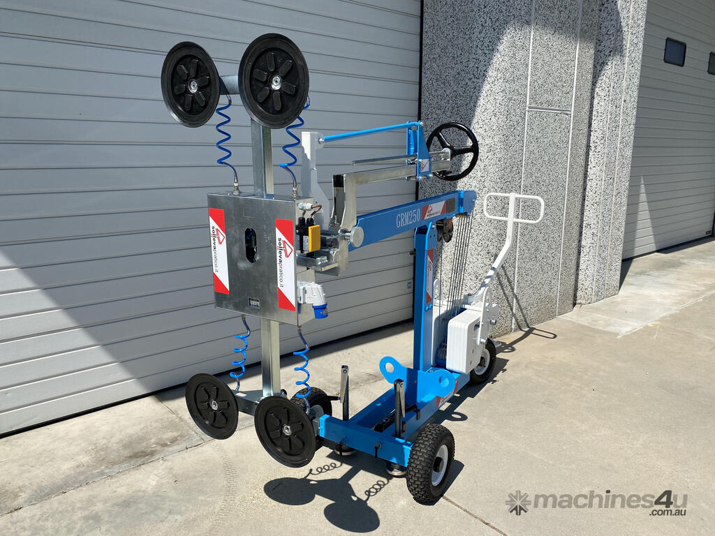 The Glass Robot GRM250 is an amazing piece of equipment. Three large suction cups can pick up a maximum capacity of 250Kg and it has a max lifting height of 2.45m. Easily pick up glass panels from the rack and rotate the glass sideways to pass through narrow aisles and doorways.