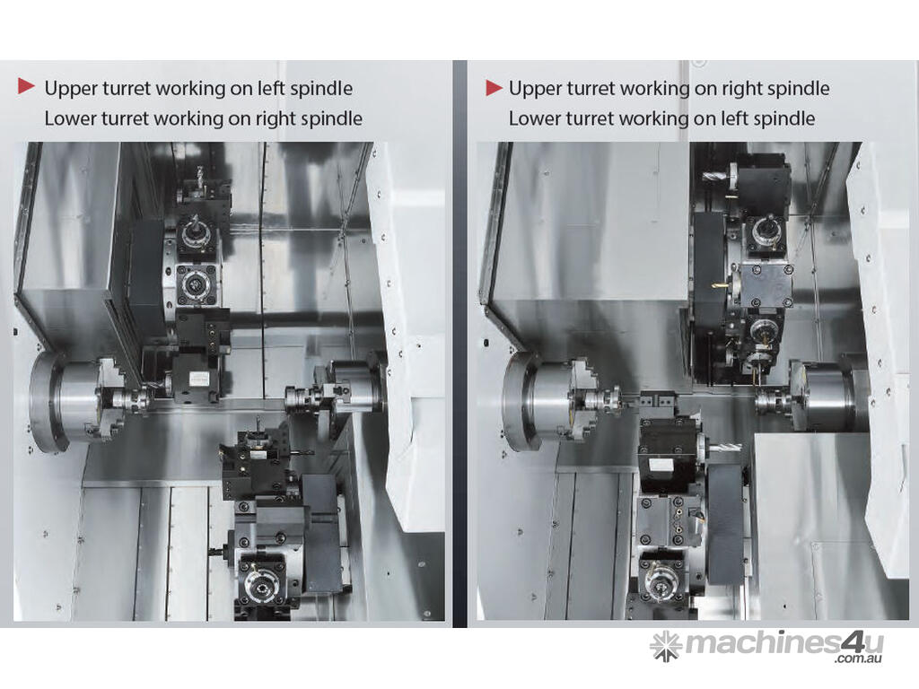 New twin spindle and twin turret combination, Upper and lower turret can be adjusted based on different machining requirements, Production capacity is 150 % larger than average models.