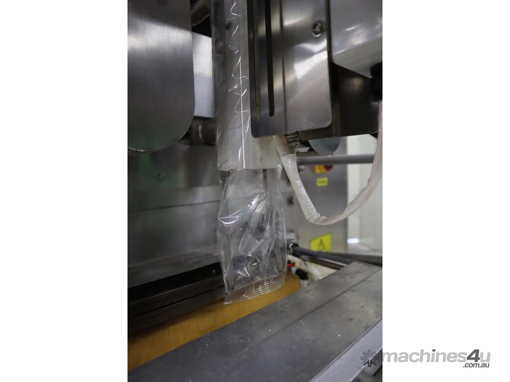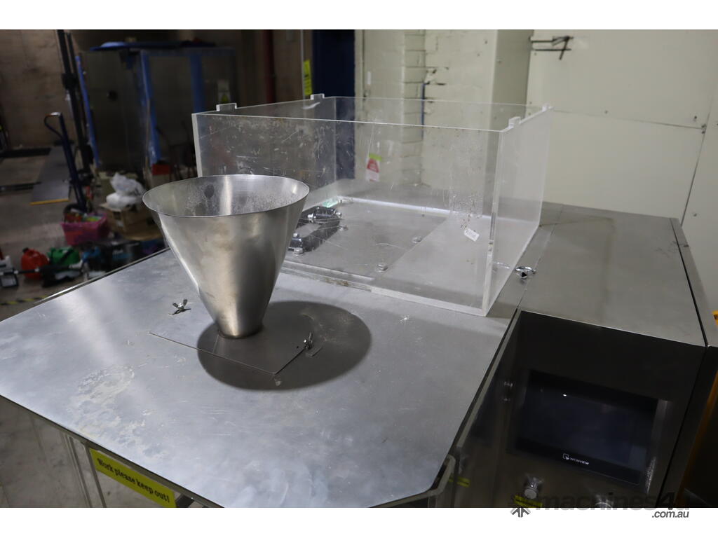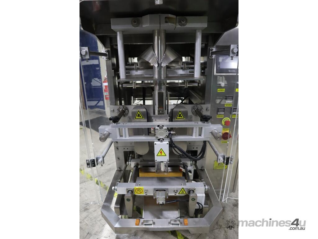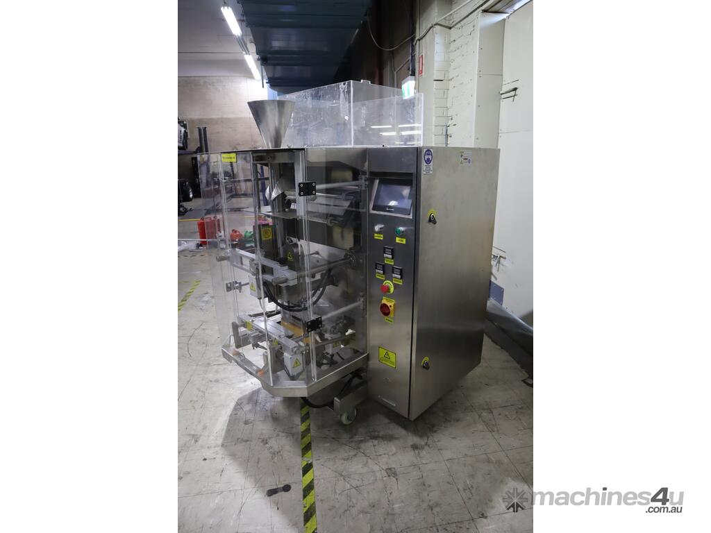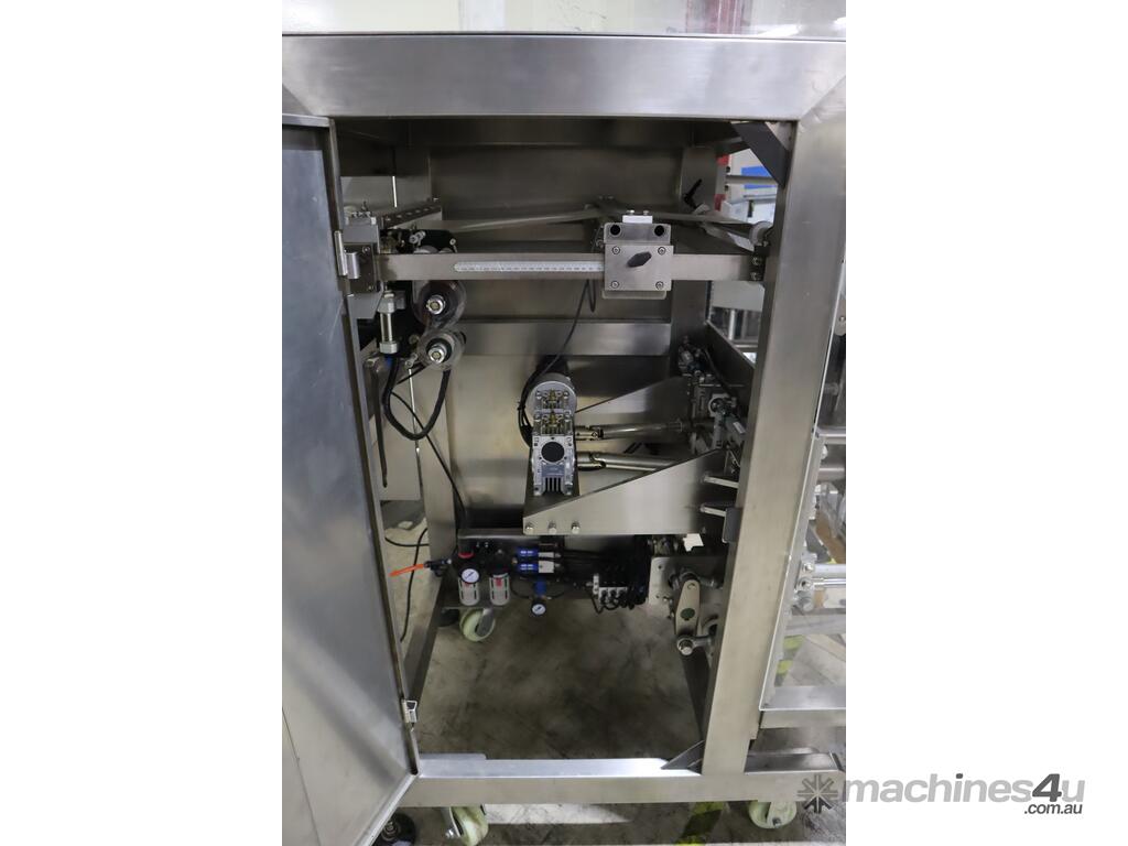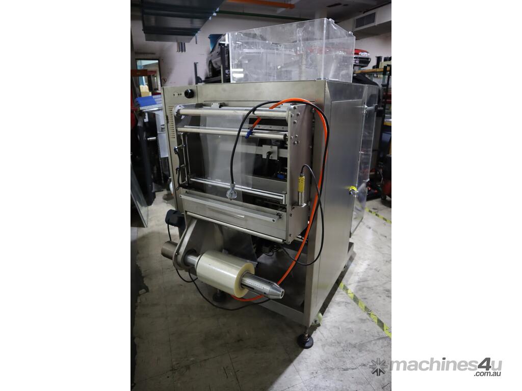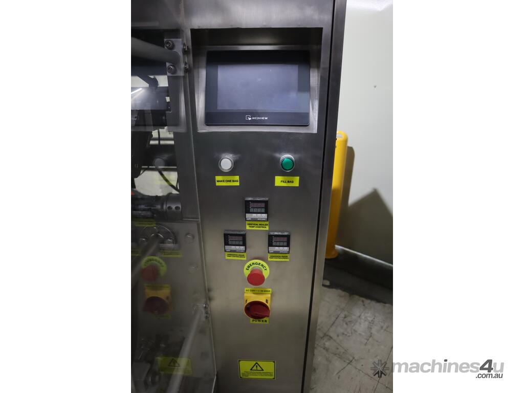 It forms sachets from a sheet of laminated plastic (roll stock). You fill the bag from the top hopper/funnel.