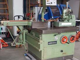 12. PANHANS 45degree TILT TENONING SLIDING TABLE SPINDLE MOULDER Model 259-4 MADE IN GERMANY Year 1985 INCLUDING VARIABLE SPEED POWER FEED UNIT x HIGH/LOW RANGES, 4 x SPINDLE SPEEDS 3000/4500/6000/9000 rpm, FORWARD/REVERSE SPINDLE ROTATION, ELECTRIC BRAKE CONTROLLED BY OVERHEAD CONSOLE, PRECISION 45degree TILT GLASS READOUT, FOLDING HANDLES FOR TILT PLUS RISE AND FALL HANDWHEELS, FULLY ADJUSTABLE TENONING TILTING TABLE, MANUAL CLAMP FOR WORKPIECES. VERY HEAVY DUTY, VERSATILE TOP QUALITY MACHINE.