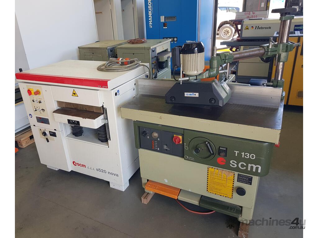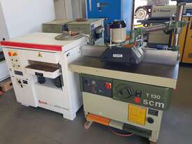 9. SCM T130N SPINDLE MOULDER 5.5kw 7.5hp 415v, LATE MODEL, MADE IN ITALY, FOOT BRAKE / FOOT LOCK, 5-SPEEDS to 10,000rpm, FORWARD & REVERSE, INCLUDING CO-MATIC MULTI SPEED 3 x WHEEL POWER FEED UNIT 240v, FULL SET OF MANUALS / TOOLS. WELL ABOVE AVERAGE CONDITION, 1 x OWNER. REQUEST EXTRA PHOTOS