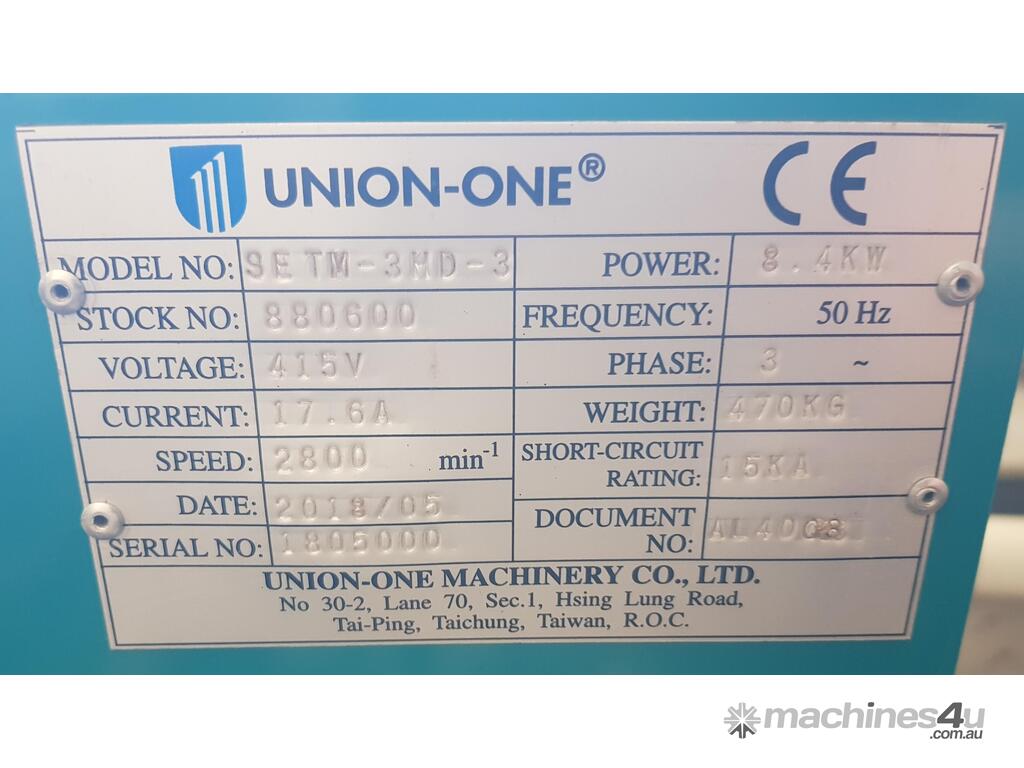 4. UNION-ONE SINGLE-END TENONER 3 X SPINDLES/CUTTERS, SLIDING TABLE, Model SETM-3HD-3, MADE IN TAIWAN Year 2018, 8.4kw 415v SEMI-AUTOMATIC OPERATION, TOP & BOTTOM VERTICAL SPINDLES + 3RD VERTICAL SPINDLE, SUIT WINDOWS & DOOR MANUFACTURE, INCLUDING 3 x CUTTERHEADS, HEAVY DUTY, TOP QUALITY & TOP CONDITION.