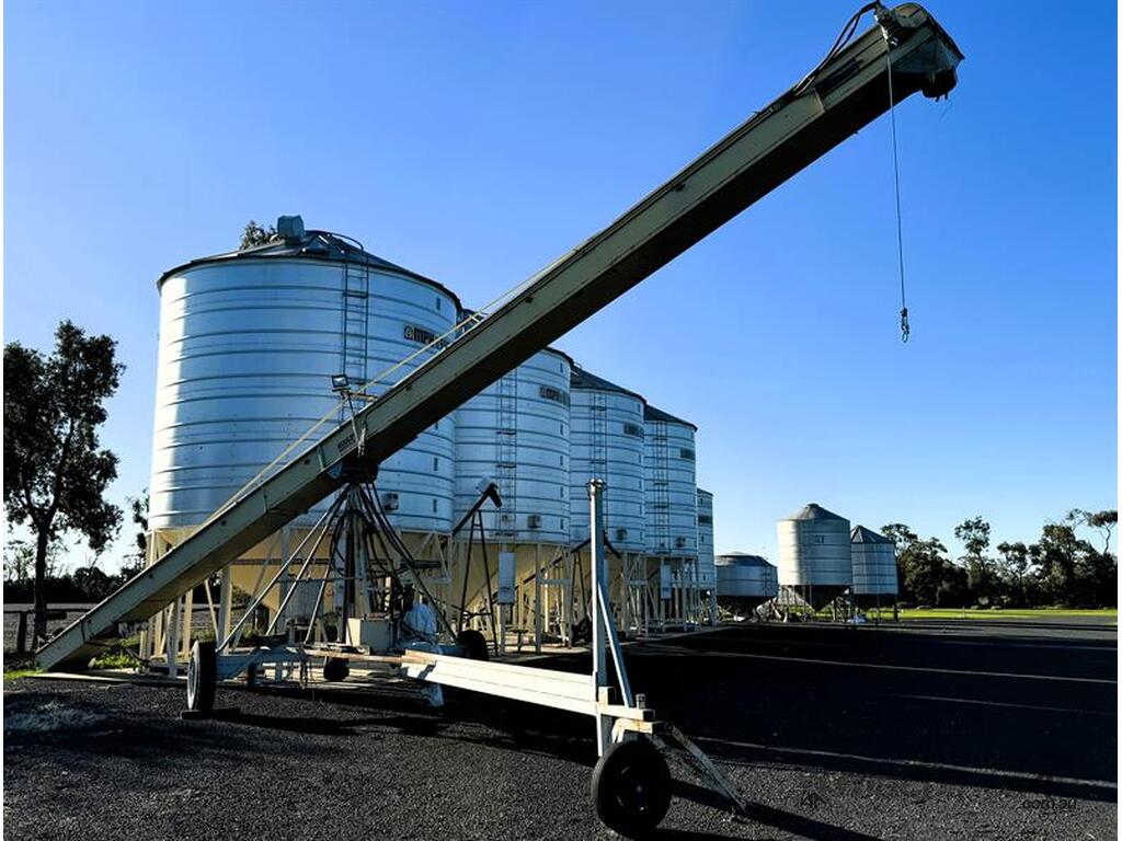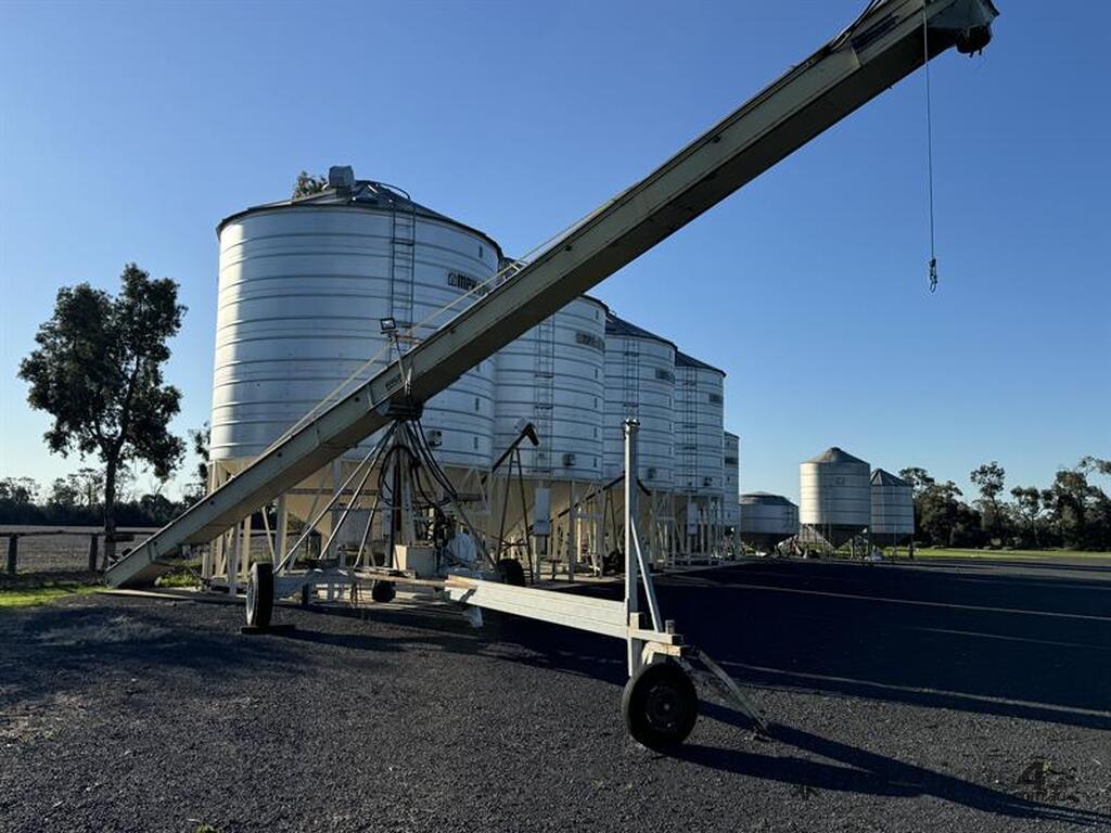 HEASLIP 65ft 4 Row Bucket Elevator GRAIN AUGER - Approximately 100T/hr, Kohler petrol motor in going condition, hydraulic drive and lift, belt in good condition. Worklights on frame with power socket. Steel auger spout attachment included for loading trucks. Located Pallamallawa, NSW. Contact Sandy Bailey for more information.
