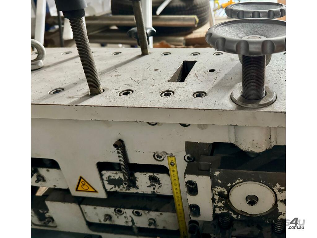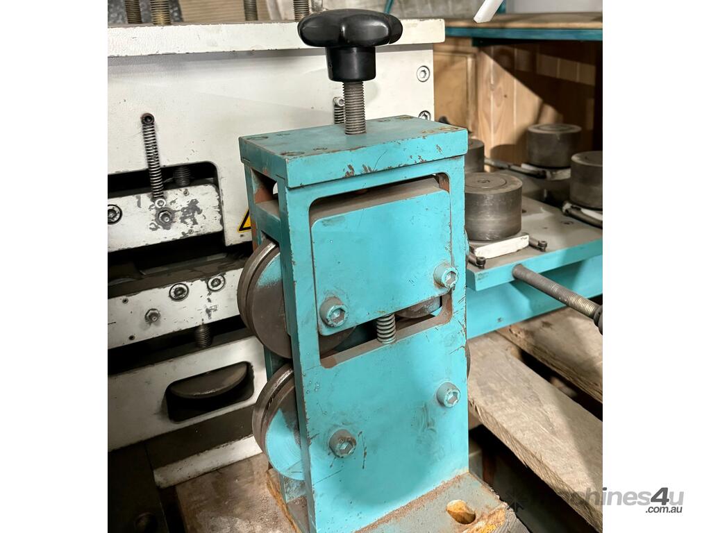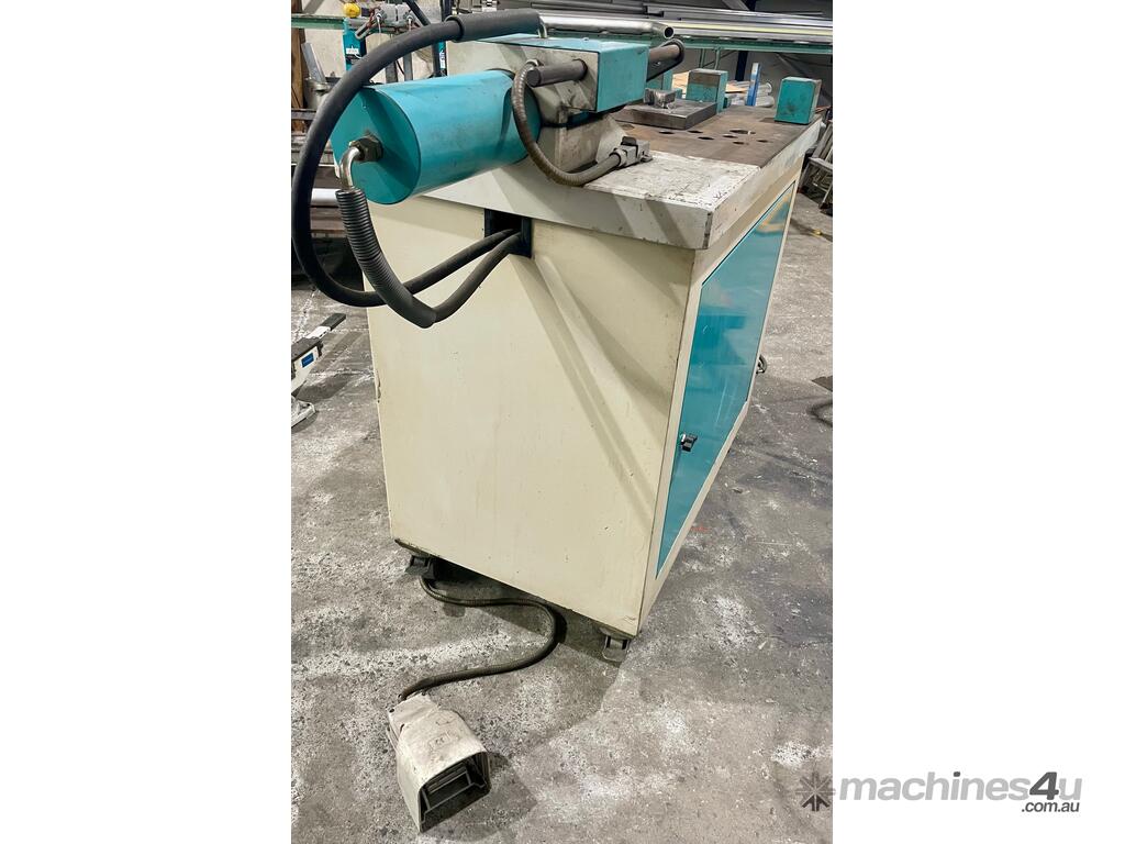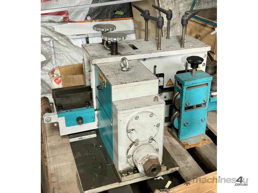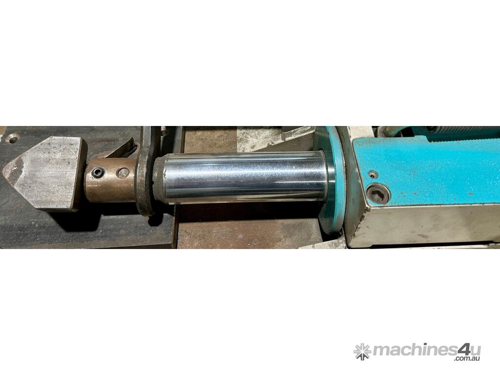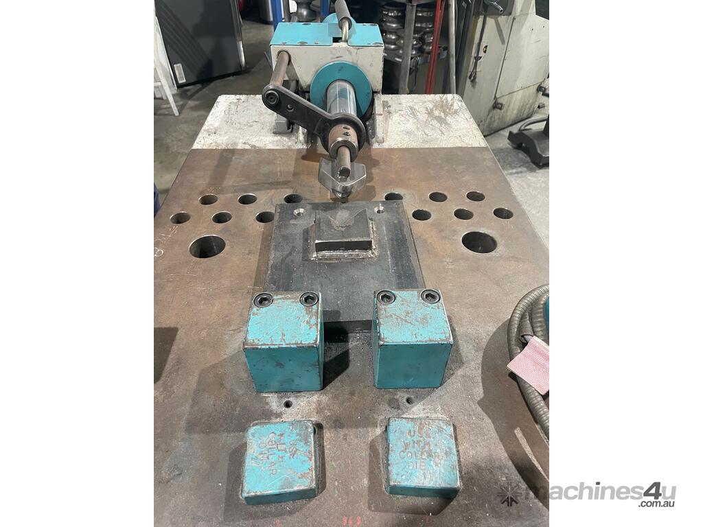 Endforging unit with two driven shafts, which can make both narrow and wide forges, as well as spear points. The material must be heated before operation.