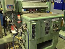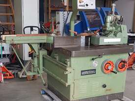 12. PANHANS 45degree TILT TENONING SLIDING TABLE SPINDLE MOULDER Model 259-4 MADE IN GERMANY Year 1985 INCLUDING VARIABLE SPEED POWER FEED UNIT x HIGH/LOW RANGES, 4 x SPINDLE SPEEDS 3000/4500/6000/9000 rpm, FORWARD/REVERSE SPINDLE ROTATION, ELECTRIC BRAKE CONTROLLED BY OVERHEAD CONSOLE, PRECISION 45degree TILT GLASS READOUT, FOLDING HANDLES FOR TILT PLUS RISE AND FALL HANDWHEELS, FULLY ADJUSTABLE TENONING TILTING TABLE, MANUAL CLAMP FOR WORKPIECES. SPANNER/SPACERS INCLUDED.VERY HEAVY DUTY, VERSATILE TOP QUALITY MACHINE. REPLACEMENT COST OVER $ 50k