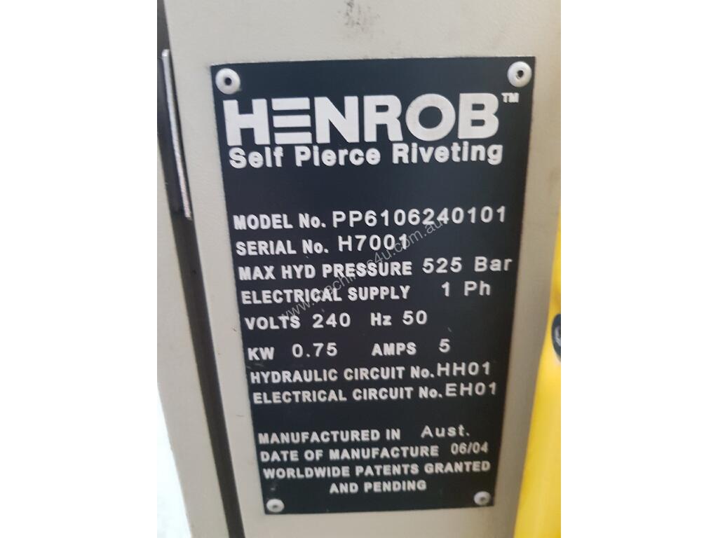 * HENROB HYDRAULIC SELF-PIERCING RIVETER Model H7001 Serial# PP, SUPERIOR 'NO HOLE' TECHNOLOGY, DESIGNED IN UK, MADE IN AUSTRALIA, LATE MODEL, INCLUDING ENERPAC HYDRAULIC POWER PACK 240v, UNIQUE DESIGN & SYSTEM (TM 'Innovative Joining Solutions'). Ideal for Air Conditioning & Automotive Industries, Manufacture of Road Signs & Water Tanks, Also Light Guage Steel Frames Plus Various Sheet Metal applications, Printing & Sign Industries etc. Including New Roll 5,000 x HENROB RIVETS. Ideal for Mobile Application (240v) SPECIAL TO 15/10/20 - POA * SOLD 23/10/20 *