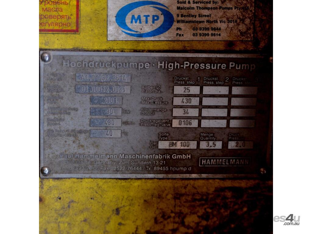 HAMMELMANN HIGH PRESSURE Water blast blaster PUMP 30KW 430bar A bit over 6200 PSI MAX PRESSURE 3 phase MOTOR ON SKID