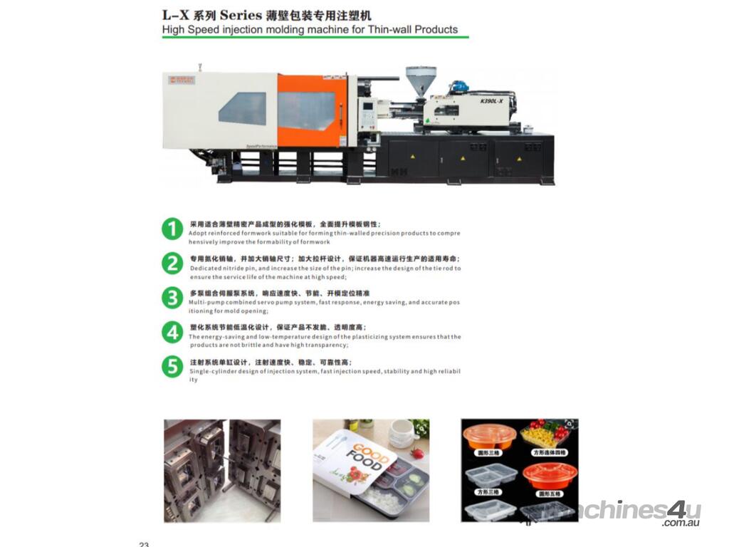 TEKWELL MACHINERY OFFERS THE L-X SERIES HIGH SPEED SERVO DRIVE ENERGY SAVING INJECTION MOUDLING MACHINE FOR THIN WALLED COMPONENTS RANGING FROM 280 TONS TO 460 TONS CLAMPING FORCE. THE SHOT CAPACITY RANGE FROM 352 GMS TO 508 GMS. HIGH INJECTION RATES OF 663 CM3/SC TO 1169 CM3/SEC.