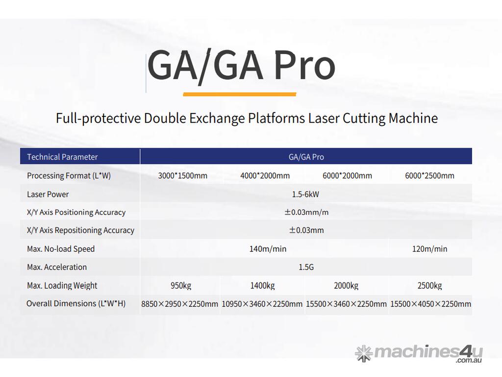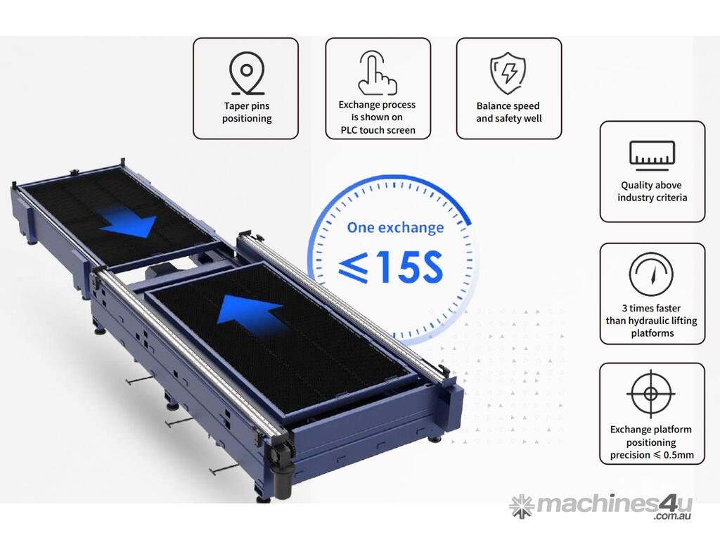 - 3000 x 1500 sheet capacity with fully annealed frame, including an automatic pallet-exchange system for increased productivity