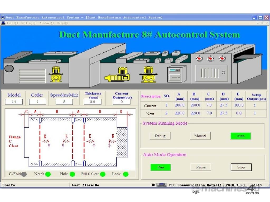 This auto line consists of twin Decoiler (a special design which is easy to load coils in construction site), straightening, beading, punching, notching, shearing, patented automation Pittsburgh lock forming (shearing, Pittsburgh lock, right angle lock in one time), duplex TDF flange forming, duplex right angle lock forming (for angle iron), and TDF folding. It