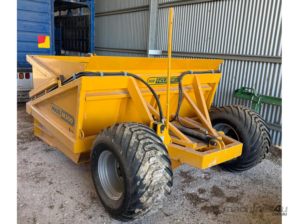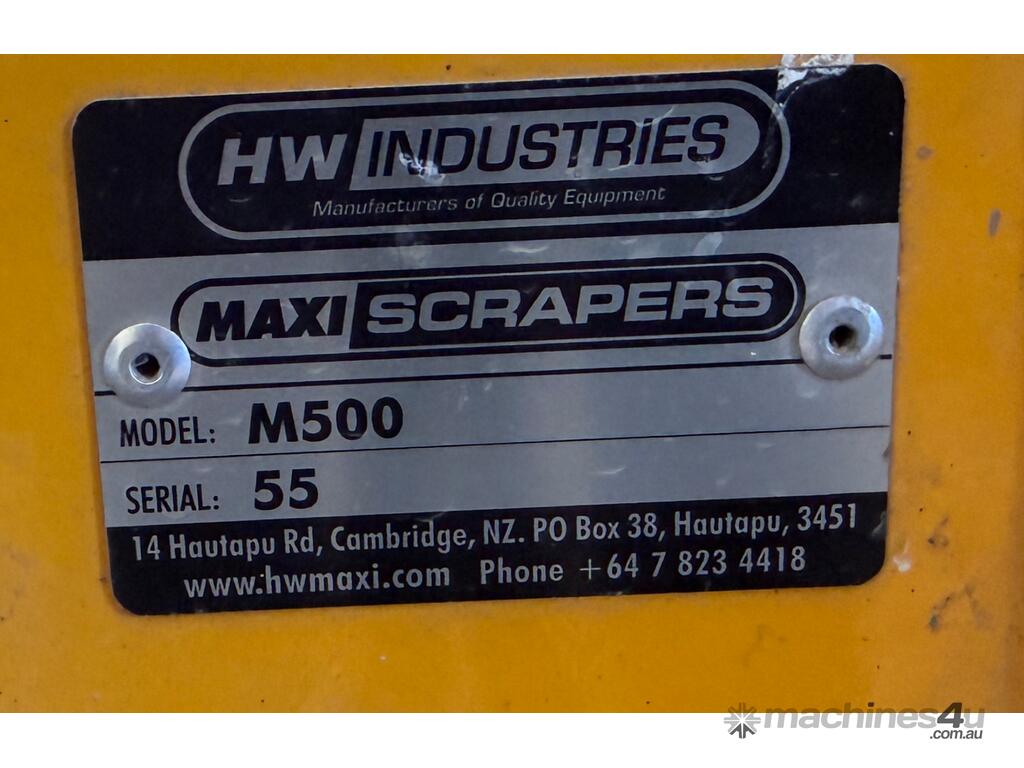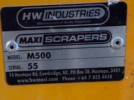 The HW Industries Maxi Scraper M500 is a specific model of linkage arm earthmoving scraper with a 5m³ load capacity and 2.4m cutting width.