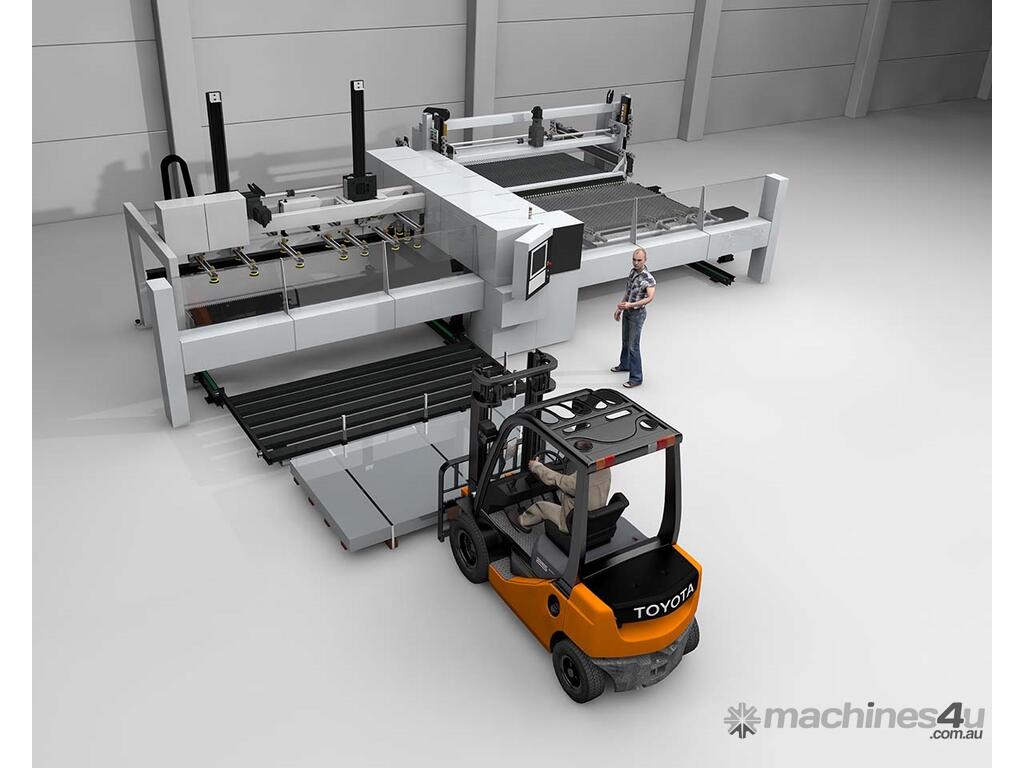 The function of the loading system is to load individual metal sheets onto the table of the machine by picking them from a stack of sheets.
