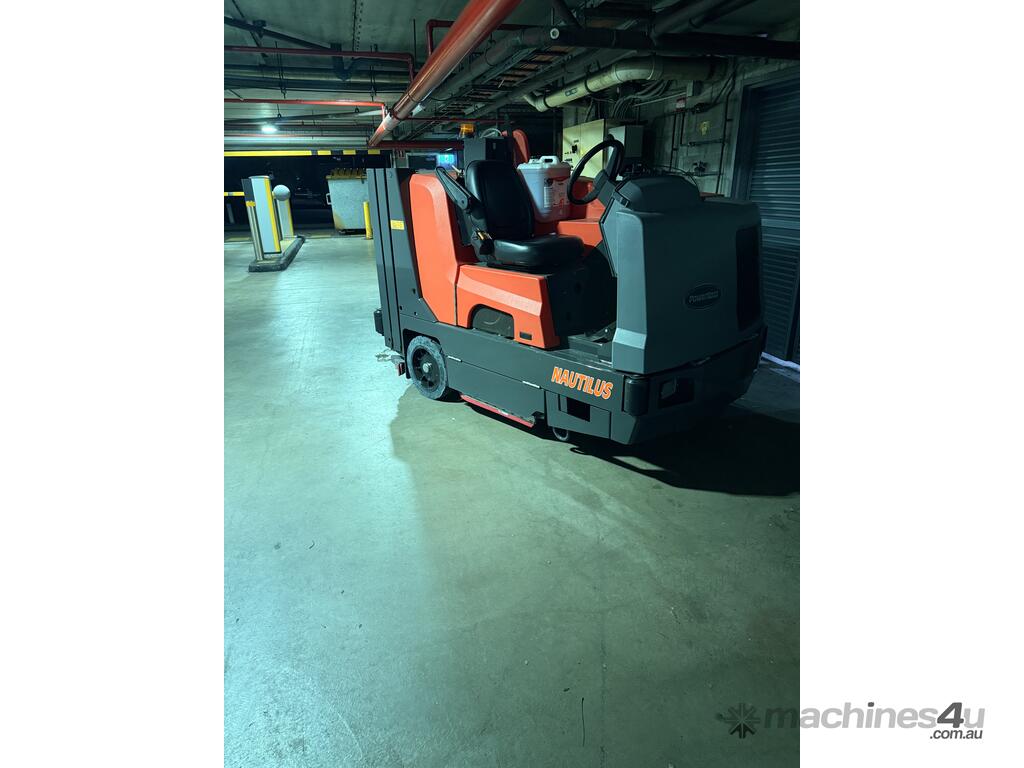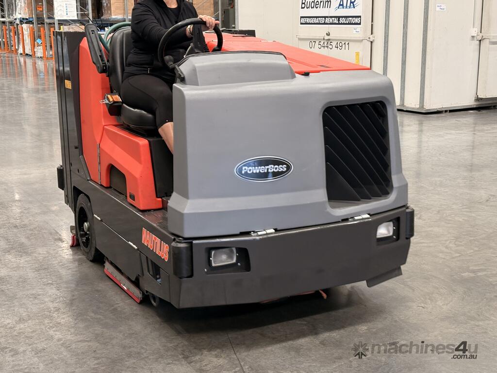 Hako The Hako PowerBoss Nautilus is an industrial ride-on scrubber-sweeper designed for cleaning large and extra-large areas, offering exceptional power, efficiency, and durability through its robust stainless steel construction, large tanks, and high-performance hydraulic systems. It combines sweeping and scrubbing into a single pass, features a simple one-button control system, and can be powered by LPG