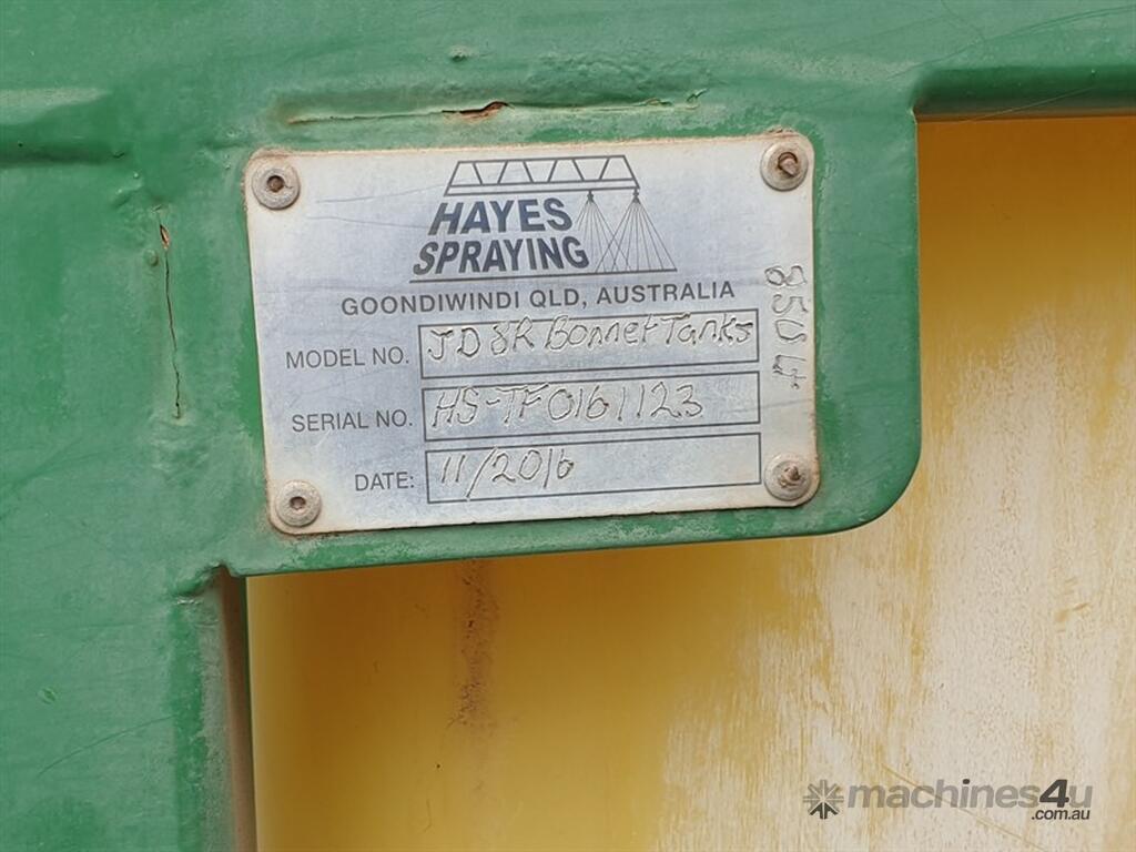 2016 Hayes Spraying John Deere 8R Series Bonnet Tanks. Approx 850L per tank, 1.5" hypro. Located near Quirindi NSW, available at MRE Auctions online sale.