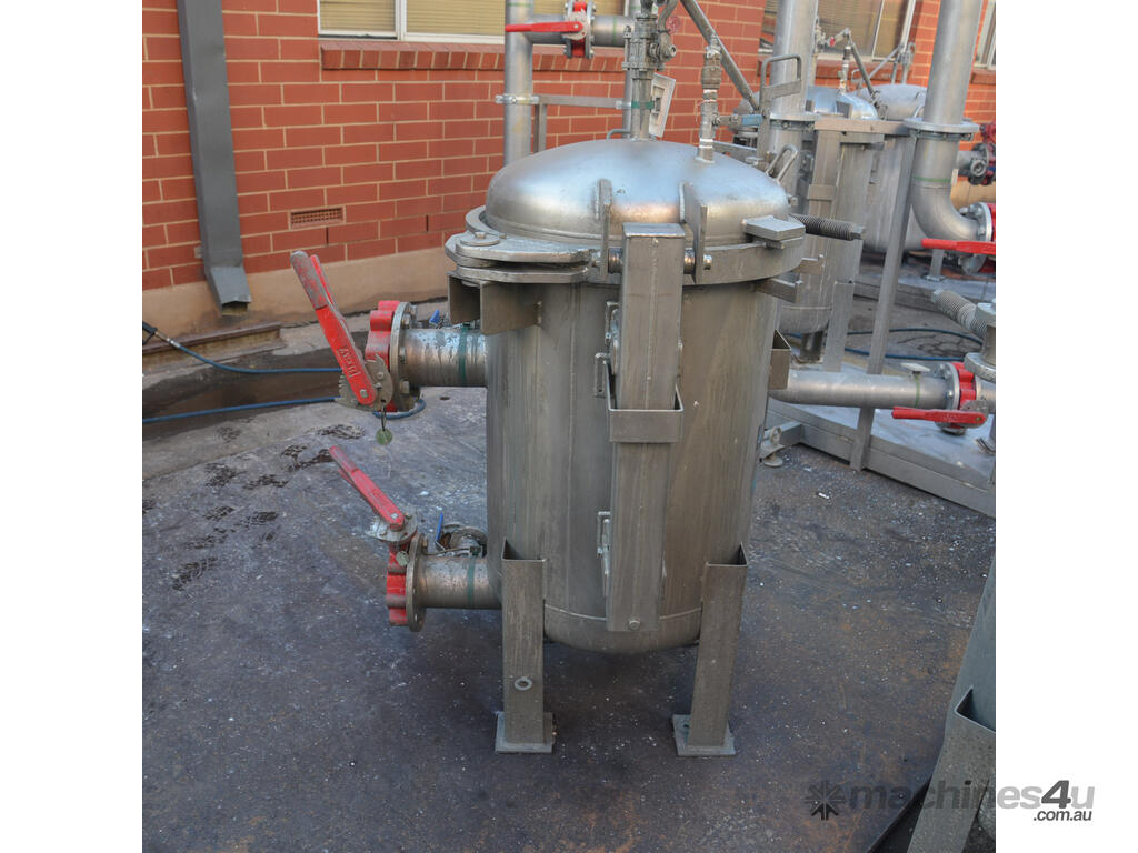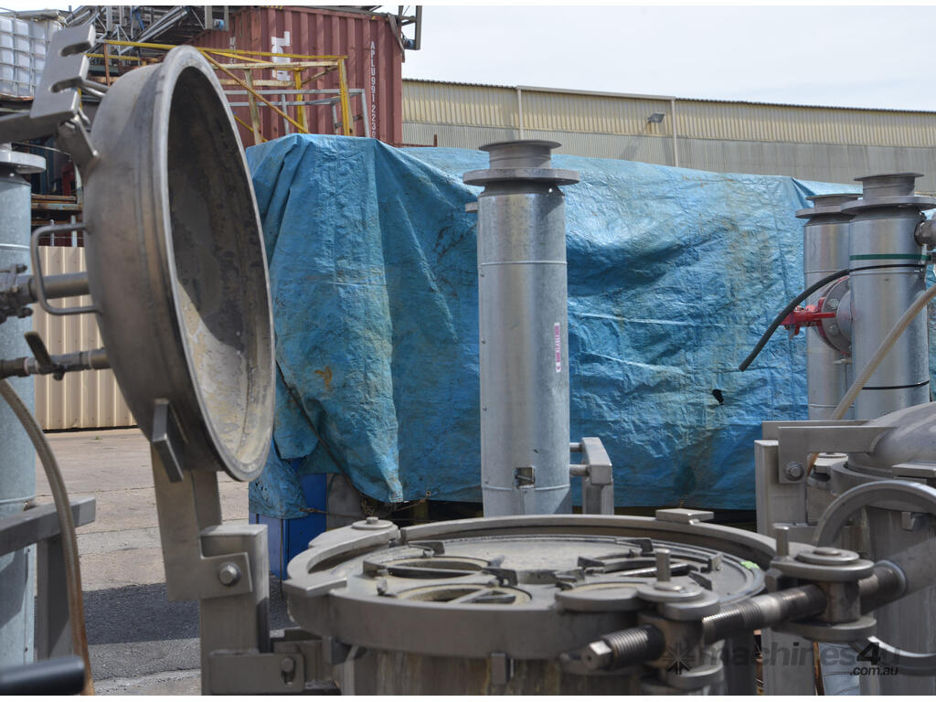 Hayward GAF Eaton 4 pot bag filter filtration filters manifold manifolded set of 4 stainless steel pressure housing, 4 bags per housing. 4" 100mm connections to filter vessels , 8' 200mm connections to manifold.