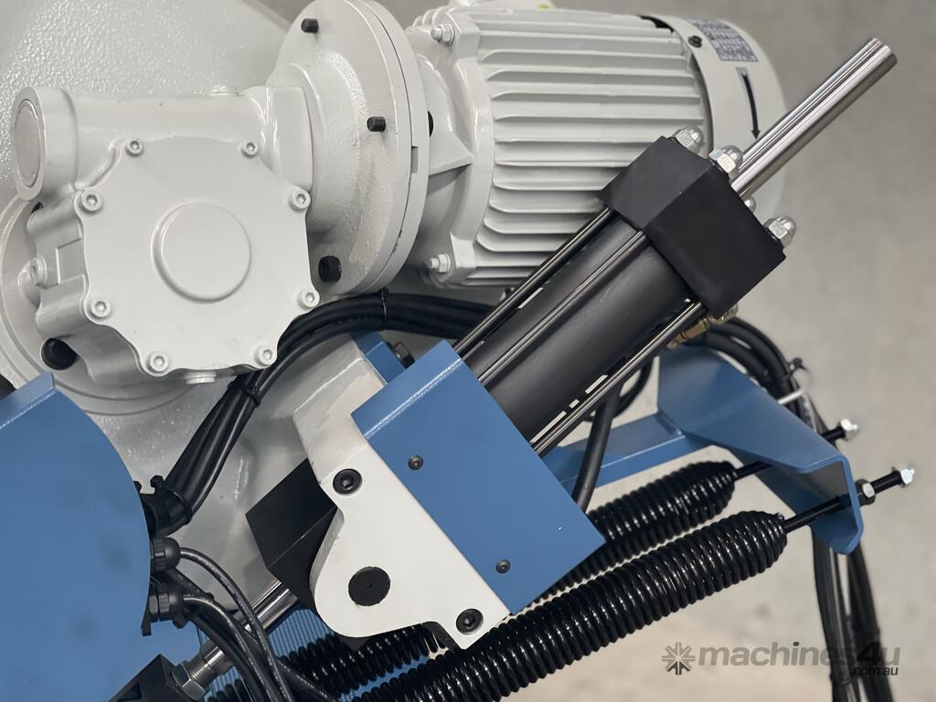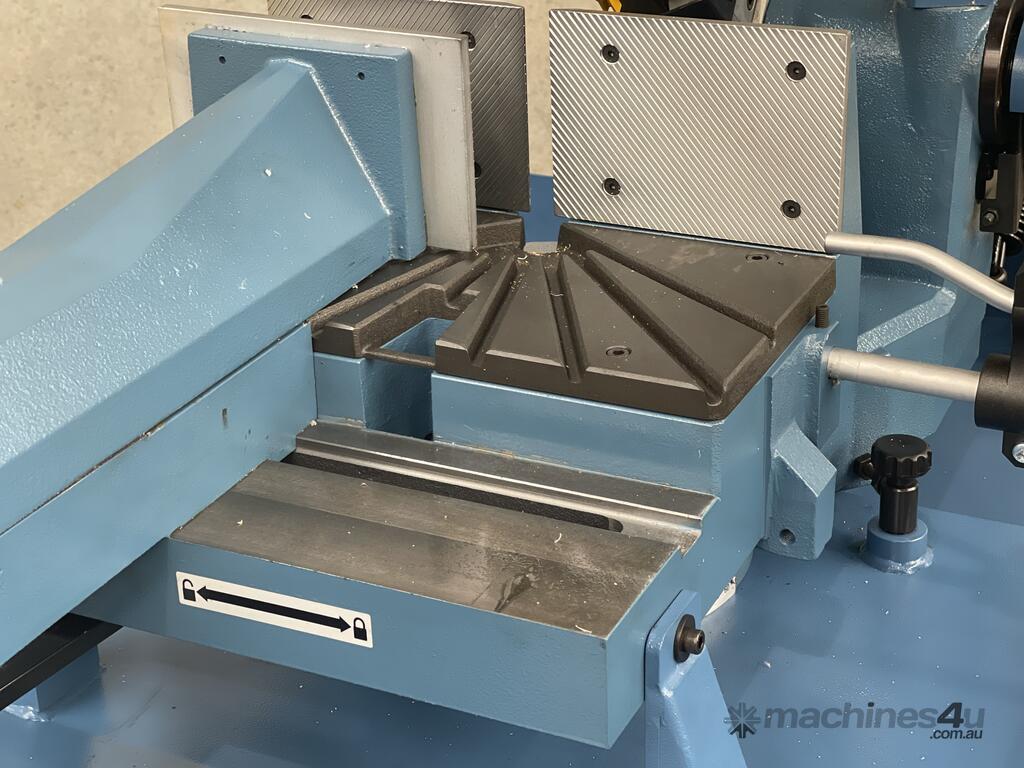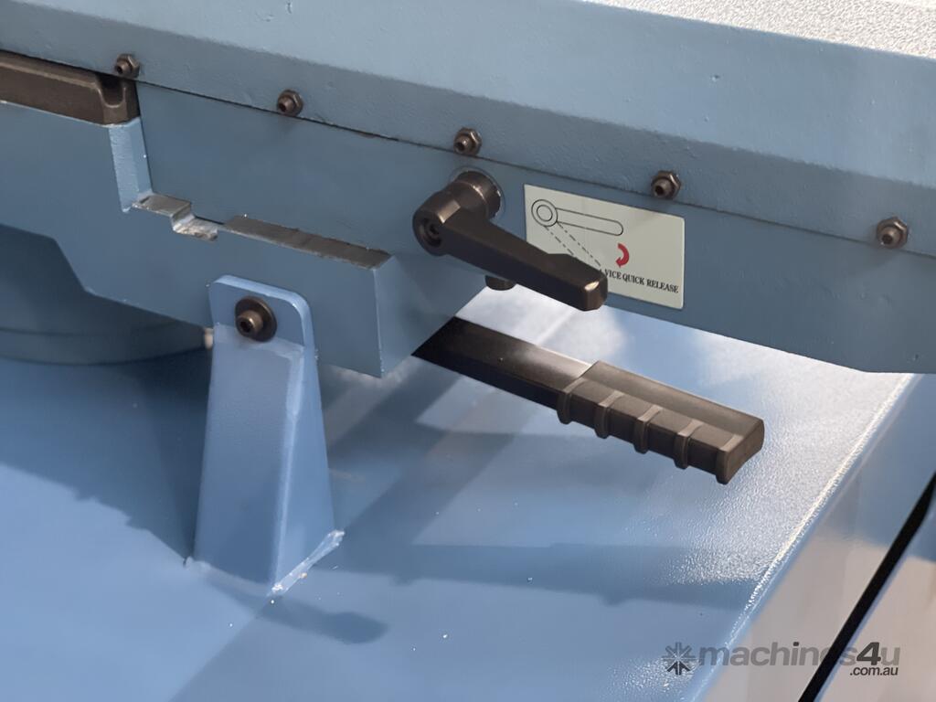 This variable speed heavy duty double miter saw is built for accuracy and production! Easy quick action angle set-ups between 0 and 60 degrees means no wasted time between cuts. Lever controlled blade guide locks allow adjustments right up to the work piece for optimum support and the blade guides have fully adjustable ball bearings, so you know you're going to get straight cuts. And when you're done, use the quick release lever and stock length stop to get on with the next cut. It's fast and simple to use! We have included other features including carbide blade guides, blade pressure gauge, hydraulic down feed, trigger switch operation, to set this aside from other base machines.