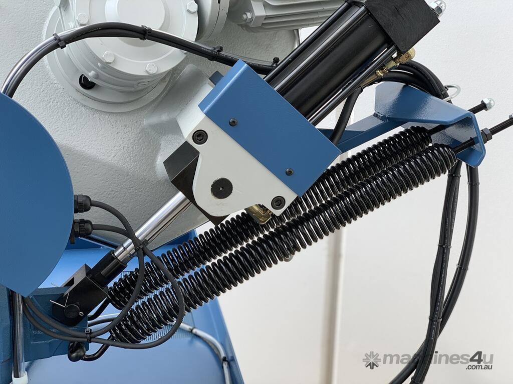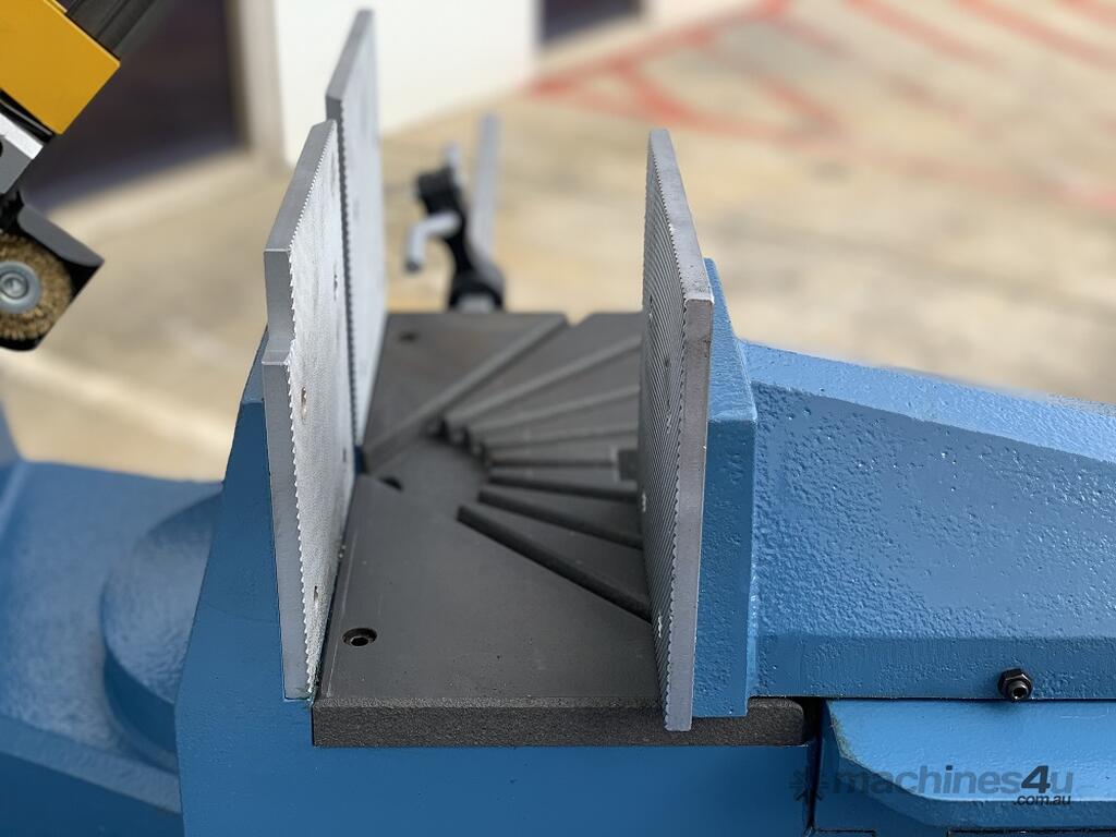 This variable speed heavy duty double mitre saw is built for accuracy and production! Easy quick action angle set-ups between 0 and 60 degrees means no wasted time between cuts. Lever controlled blade guide locks allow adjustments right up to the work piece for optimum support and the blade guides have fully adjustable ball bearings so you know you're going to get straight cuts. And when you're done, use the quick release lever and stock length stop to get on with the next cut. It's fast and simple to use! We have included other features including carbide blade guides, blade pressure gauge, hydraulic down feed, trigger switch operation, to set this aside from other base machines.