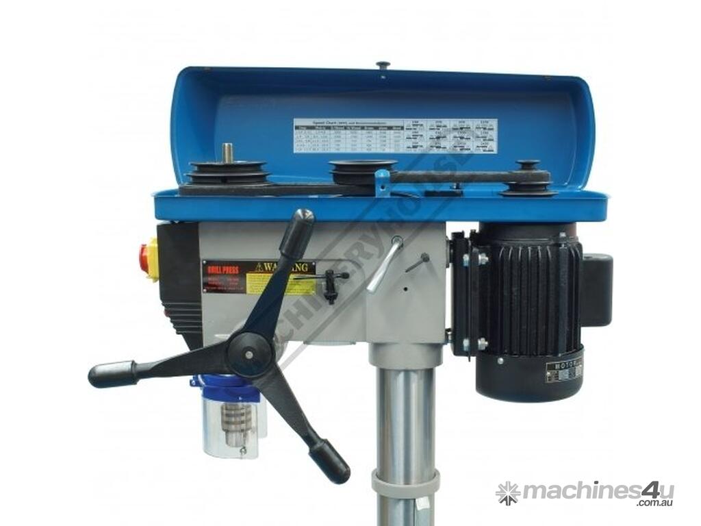 Mostly constructed from cast iron and machined steel to provide superior stability and strength. Powered by a 1.1kW, 1.5hp, 240-volt induction motor and coupled to a 12-belt speed pulley system offering wide range of speeds between 150-2450rpm. The down feed handle is also made from cast iron in one solid piece design and fitted with soft hand grips for your comfort & convenient drilling depth feed control.