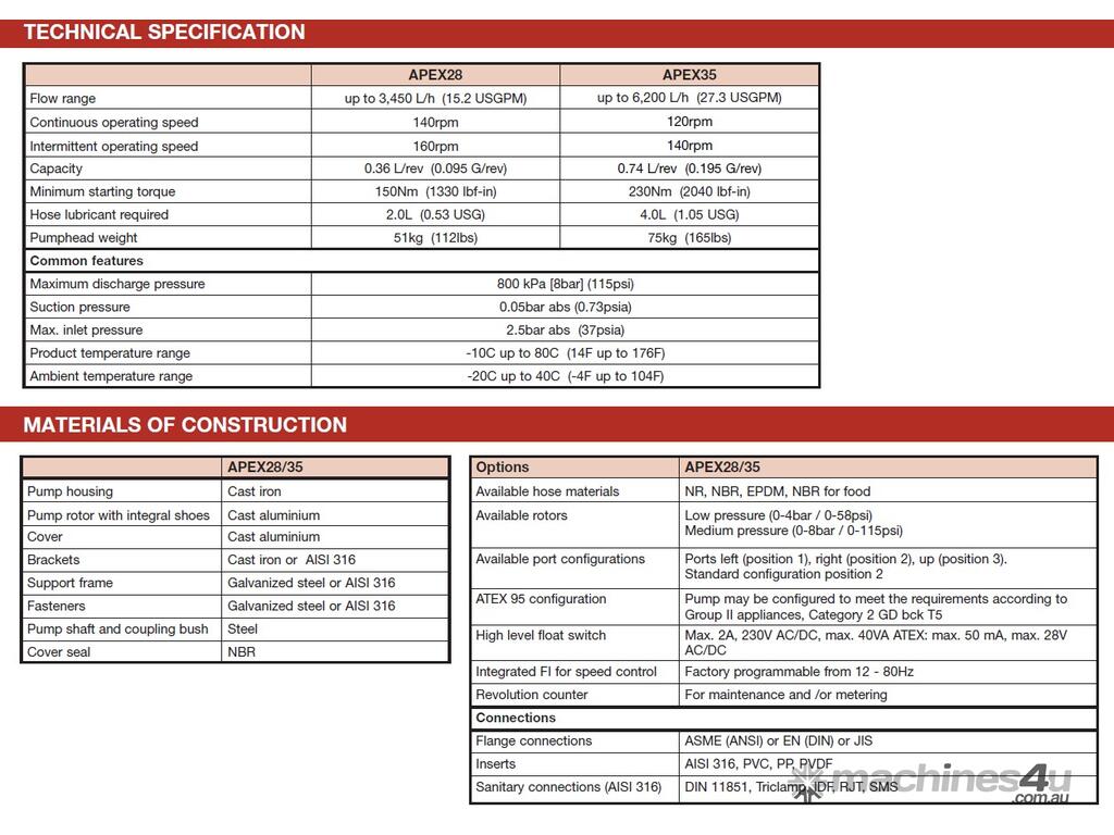 The Bredel APEX 35 is a heavy duty peristaltic hose pump engineered for industrial fluid transfer, metering and dosing applications. It features a sealless, valve less design, allowing abrasive slurries, aggressive chemicals and viscous fluids to be handled reliably with minimal maintenance. Delivering up to approximately 5,300 L/h (continuous) under normal conditions, the APEX 35 supports high flow per revolution and lower rotational speeds. With a single wearing component (the hose) and fast hose-replacement capability, this pump enables extended uptime and reduced service intervals.