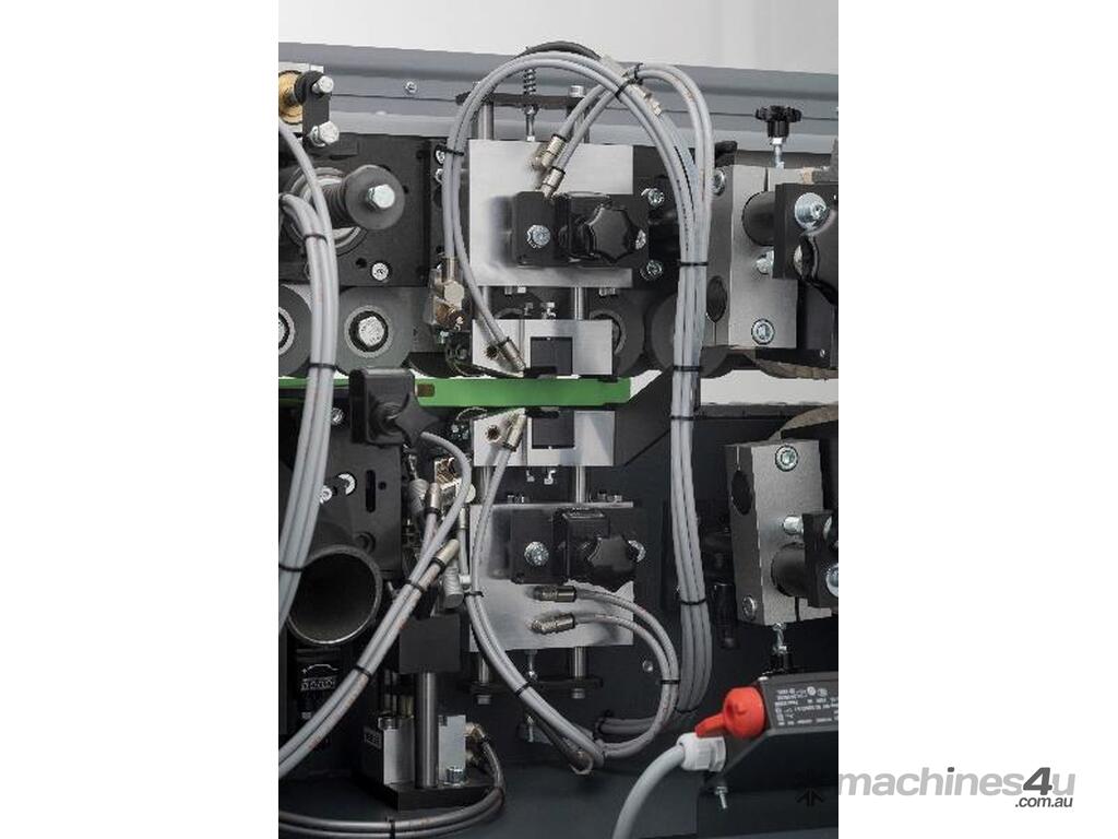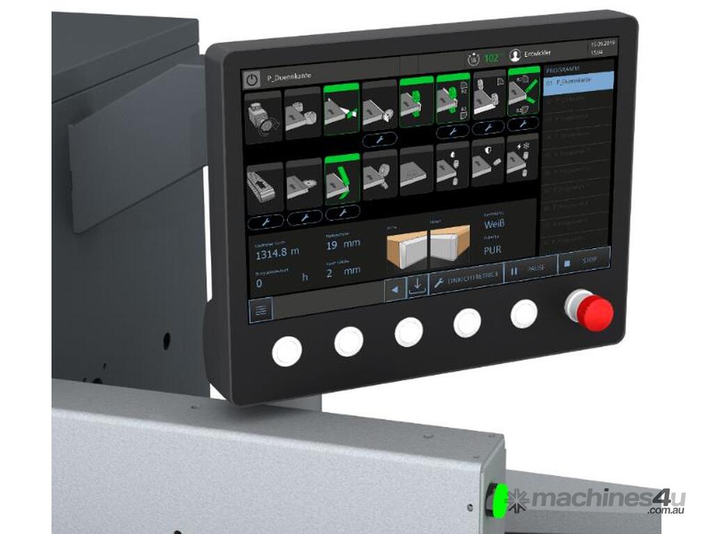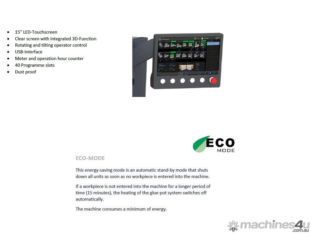 This energy-saving mode is an automatic stand-by mode that shuts down all units as soon as no workpiece is entered into the machine. If a workpiece is not entered into the machine for a longer period of time (15 minutes), the heating of the glue-pot system switches off automatically. The machine consumes a minimum of energy.