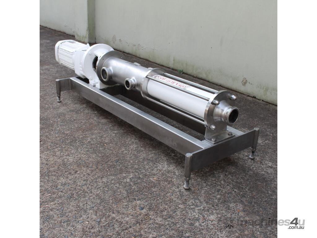 Helical Rotor Progressing Cavity Mono Type Pump, "Nova Rotor SRL" model MN-053-4, 70mm dia outlet, 24 bar pressure, driven by 3 phase 5.5kw,169 rpm gear motor, stainless steel housing, mounted on stainless steel base, overall dimension: 560mm wide x 1980mm long x 500mm high