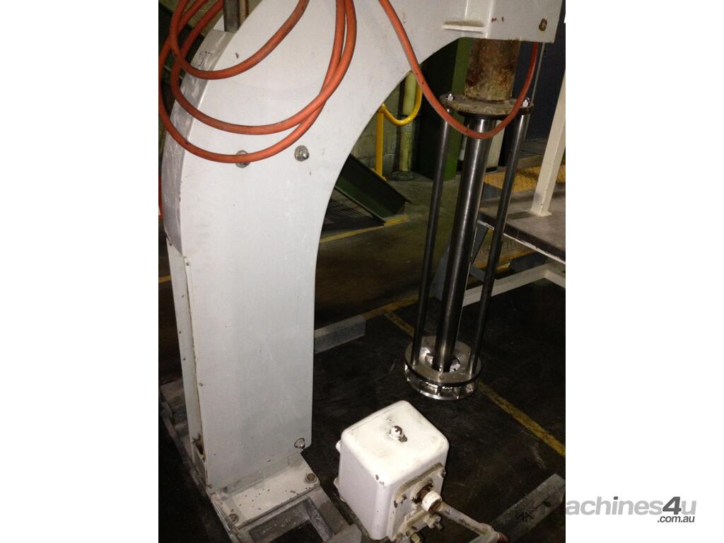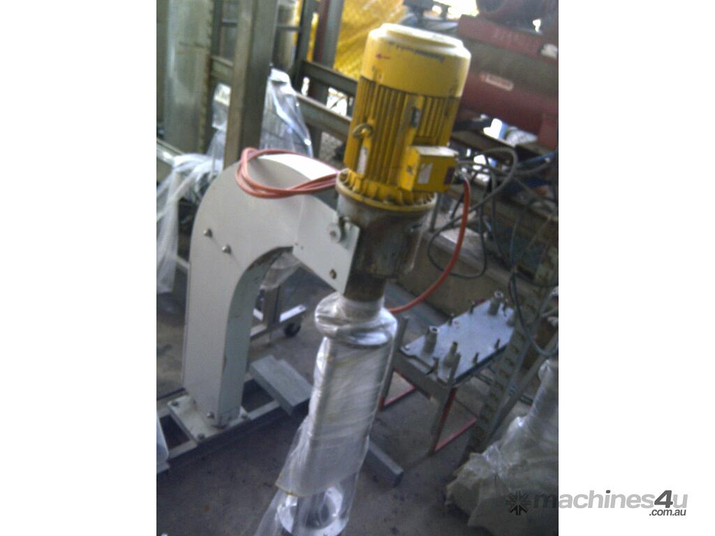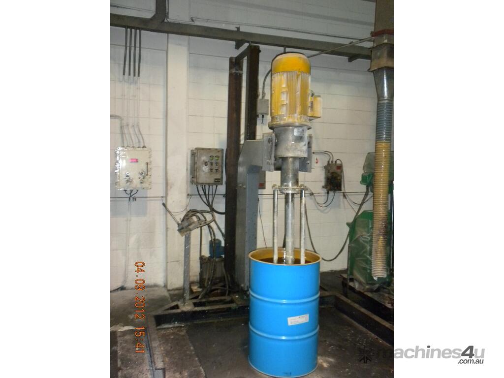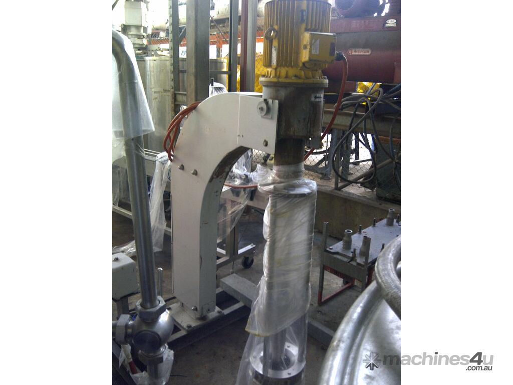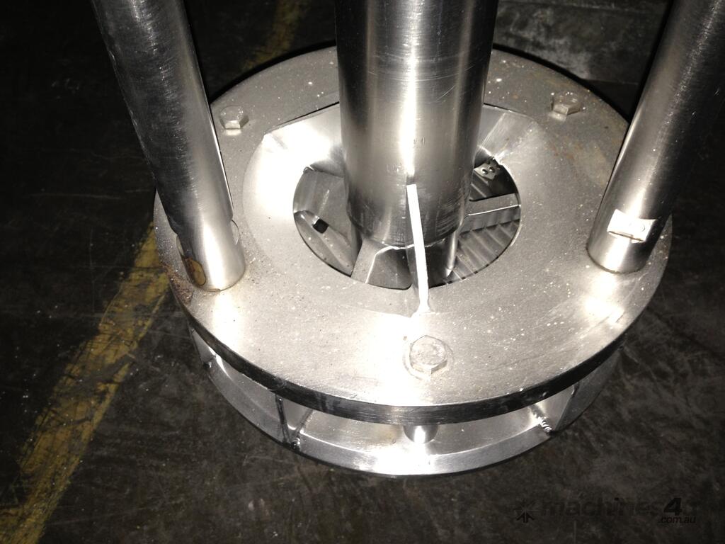 The arms of the impeller (central shaft and support rods for the shroud) are all of Stainless Steel and the immersion depth for mixing is approximately 900 mm. The arrangement can be raised and lowered by hydraulic hand pump by approx 600mm to allow a tank to be inserted below.