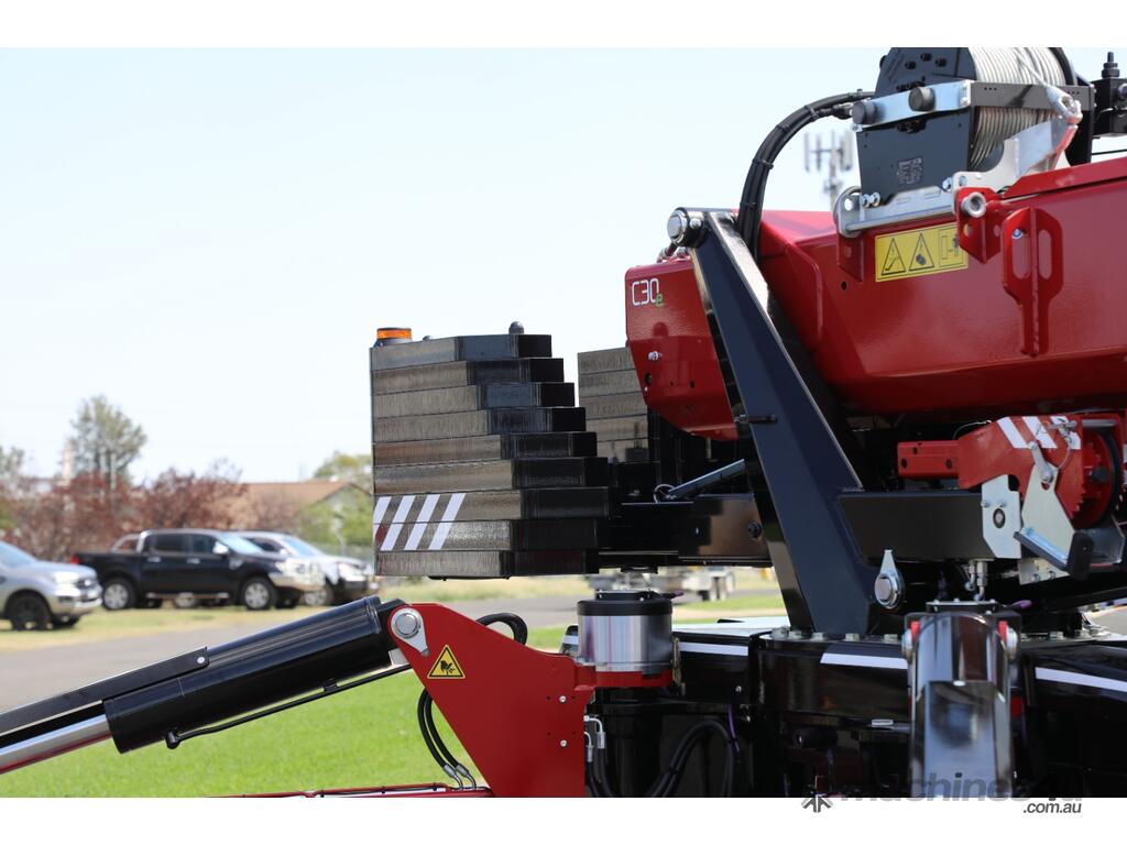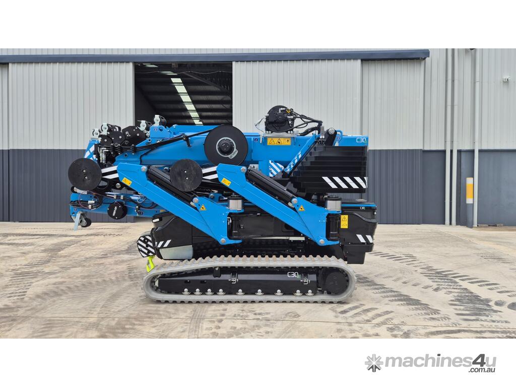 The C30e is a crane with continuous jack adjustment option. Each levelling jack calculates its position in order to determine the hoisting capacity. Its low centre of gravity and extending crawler undercarriage make it highly suitable for manoeuvring on a slope. The machine is fitted with sloping crawler supports for a large ground clearance.