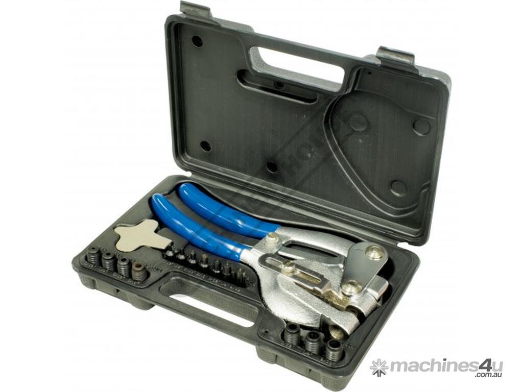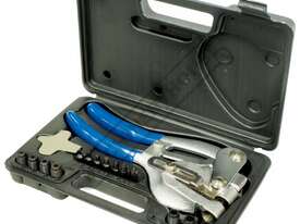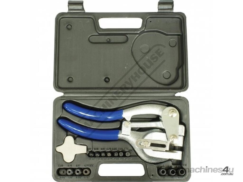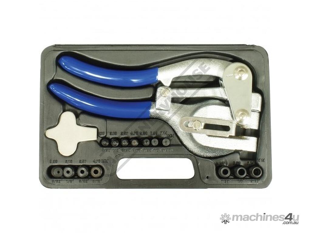 This heavy duty power punch tool punches accurate round holes through all types of materials. From thin brass metal to plastic sheet up to 1.2mm mild steel. The punch which has an adjustable edge guide, easily lets you align holes in a straight line 6mm to 38mm from the edge. Package comes with seven quick-change, durable heat treated punch-and-die sets. This set includes a durable plastic storage case.