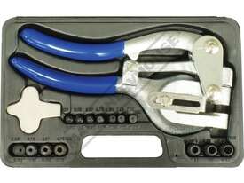 This heavy duty power punch tool punches accurate round holes through all types of materials. From thin brass metal to plastic sheet up to 1.2mm mild steel. The punch which has an adjustable edge guide, easily lets you align holes in a straight line 6mm to 38mm from the edge. Package comes with seven quick-change, durable heat treated punch-and-die sets. This set includes a durable plastic storage case.