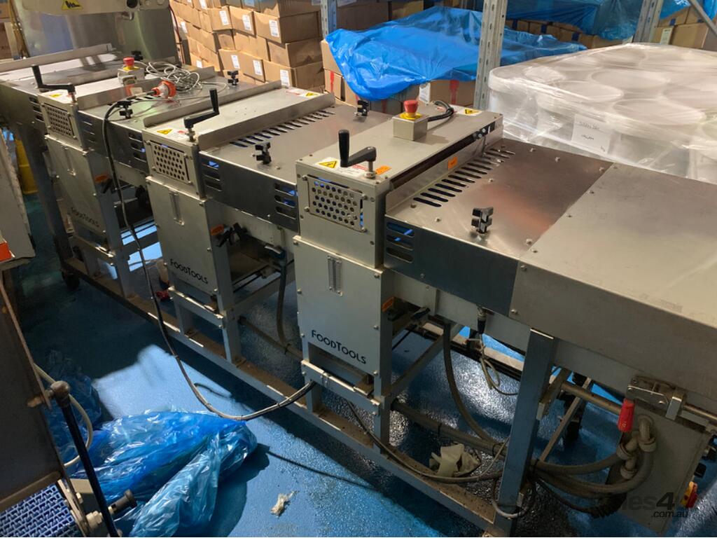 This layer cake cutting machine precisely and efficiently cuts products into horizontal slabs for a layer cake production line.
