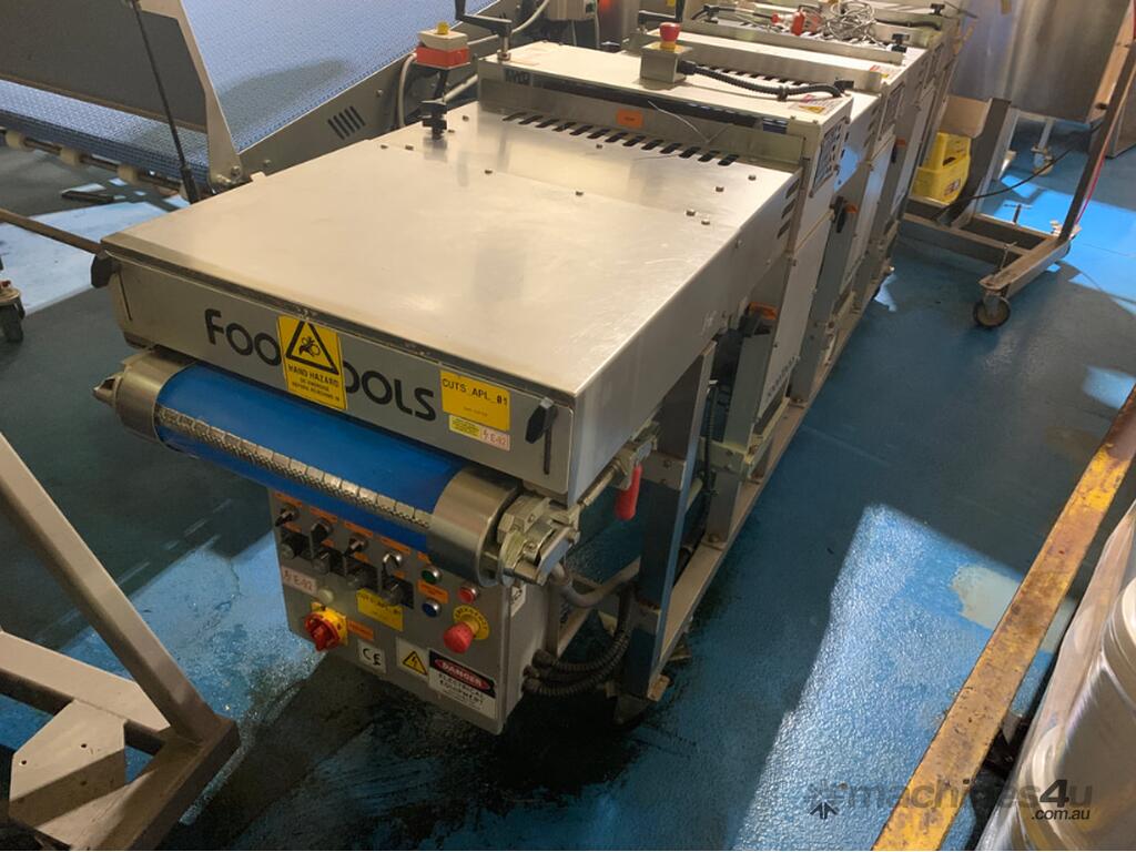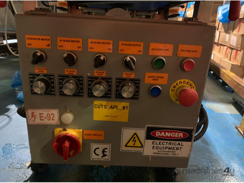 Machine comprises three (3) horizontal reciprocating Teflon-coated blades to cut consistent layers from 0.3 to 3.5 thick.