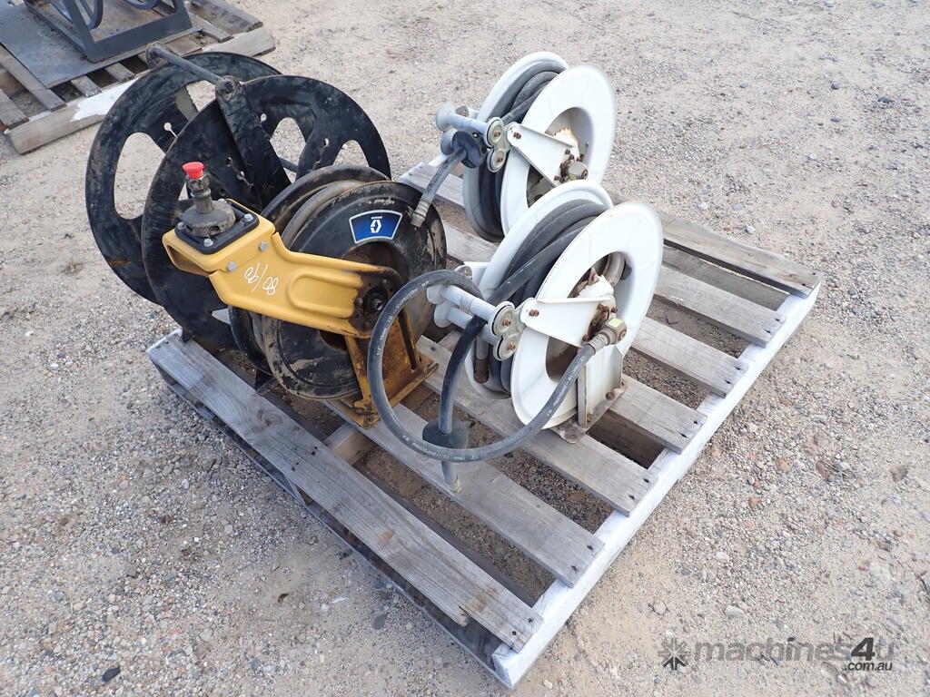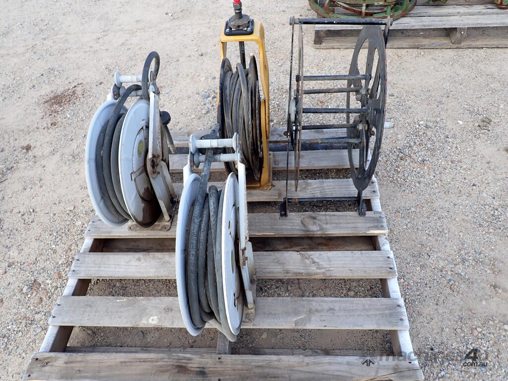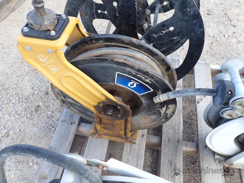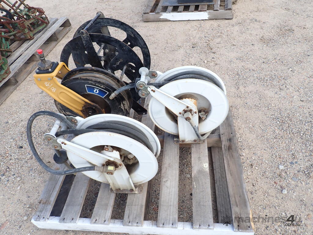 Hose reels ex a service truck, 3 Graco reels fitted with half inch hoses for oil and one reel to take one inch or 1.25 inch fuel or water hose, no nozzles, all in fair working condition, price is for the four reels as a lot, suit service truck or unit or workshop or similar.