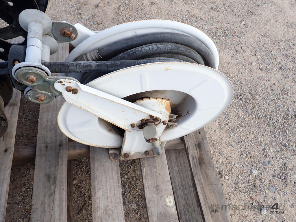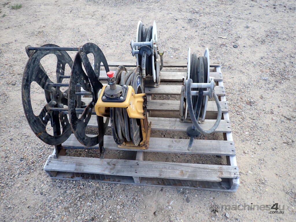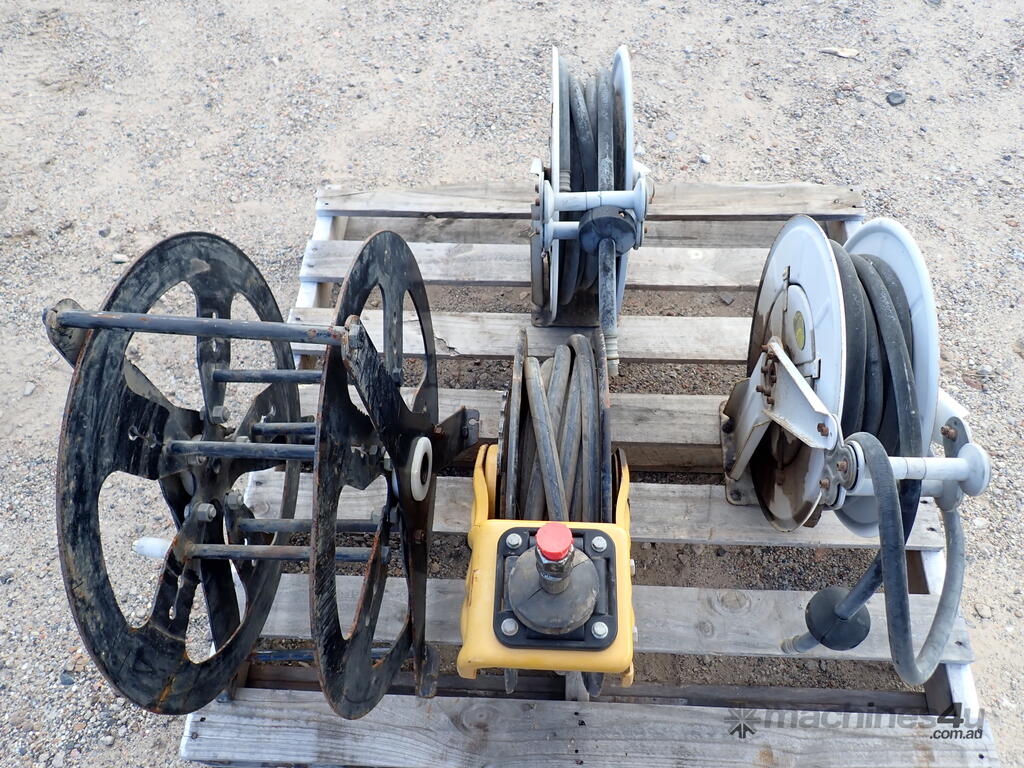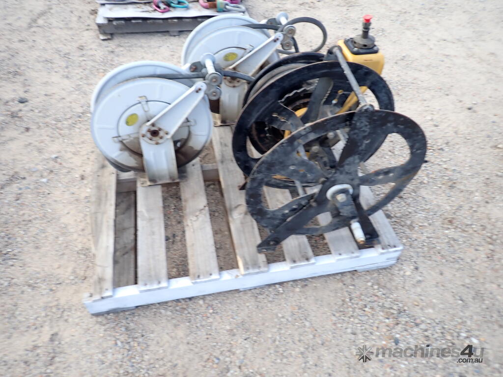 Hose reels ex a service truck, 3 Graco reels fitted with half inch hoses for oil and one reel to take one inch or 1.25 inch fuel or water hose, no nozzles, all in fair working condition, price is for the four reels as a lot, suit service truck or unit or workshop or similar.