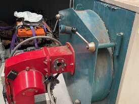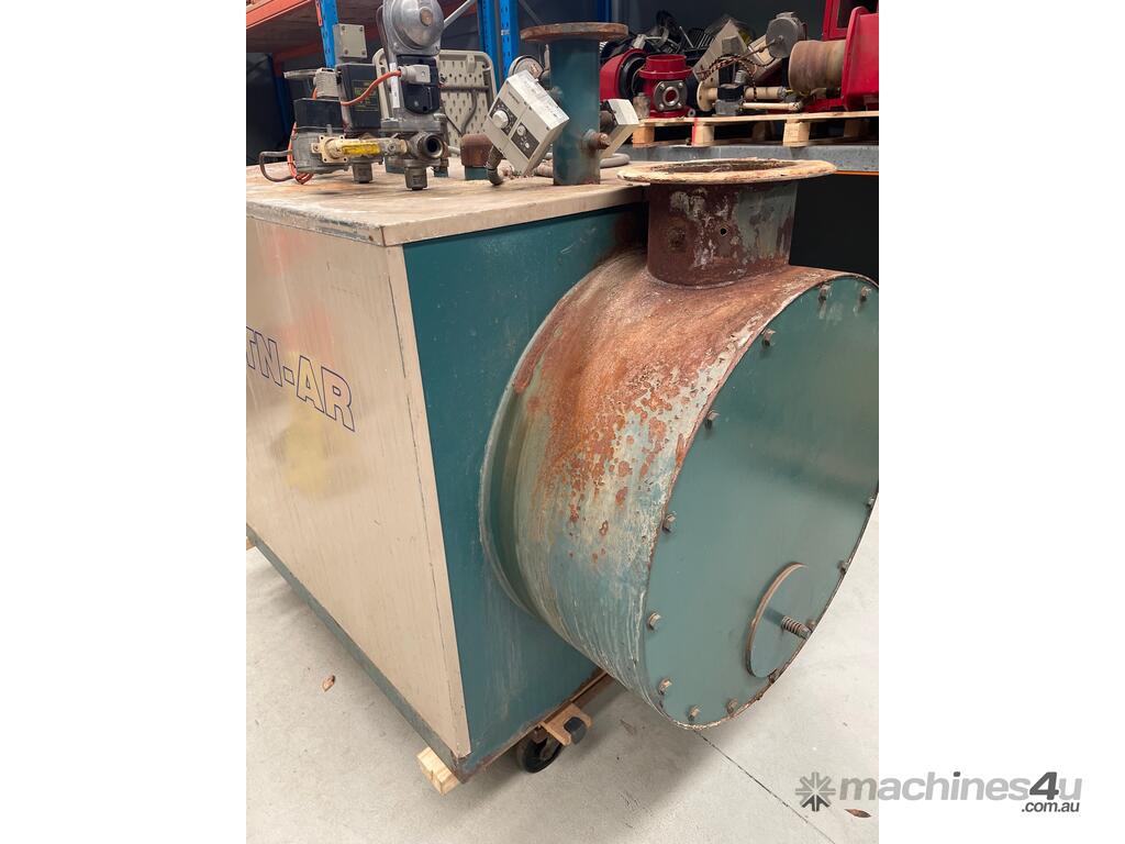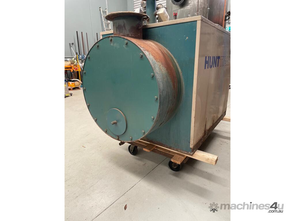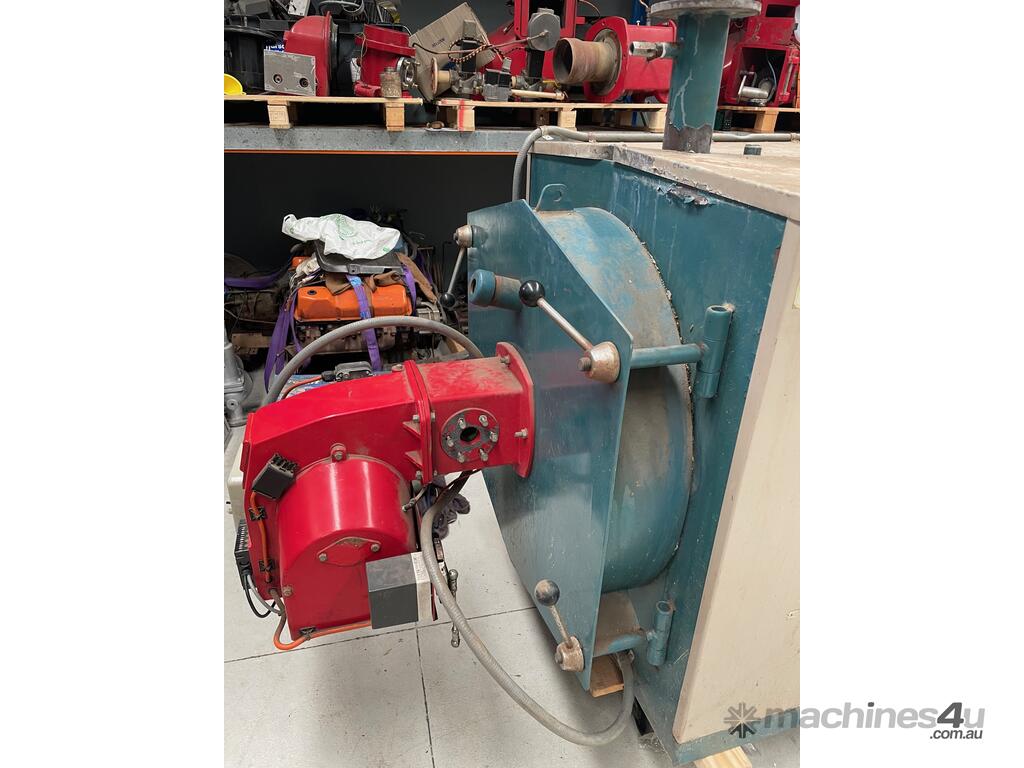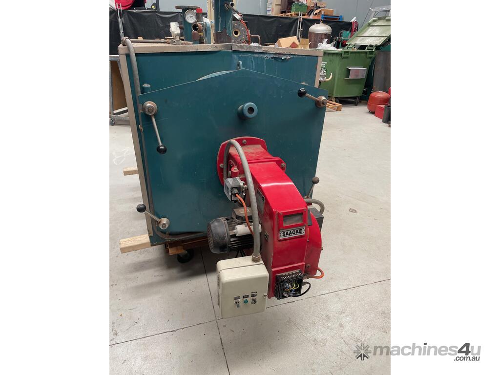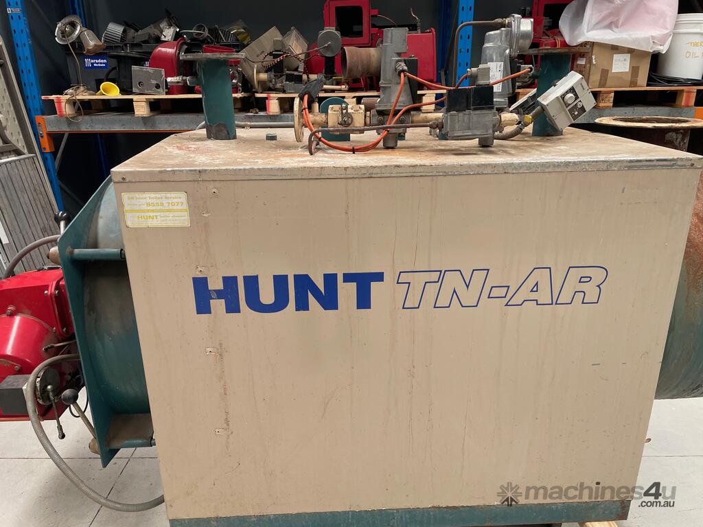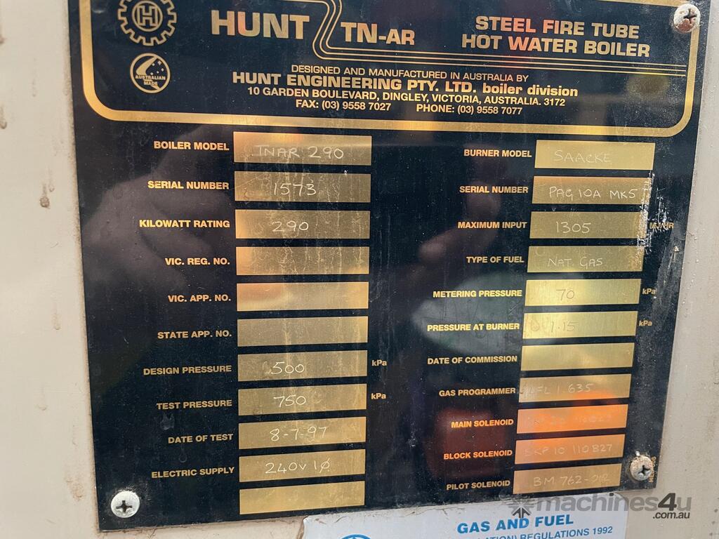 Hunt TNAR hot water boiler 290KW , 1044mj/hr set up for natural gas with Saacke burner with hi-lo modulation, gas train with Siemens main gas valves, pressure relief valve and control thermostats.