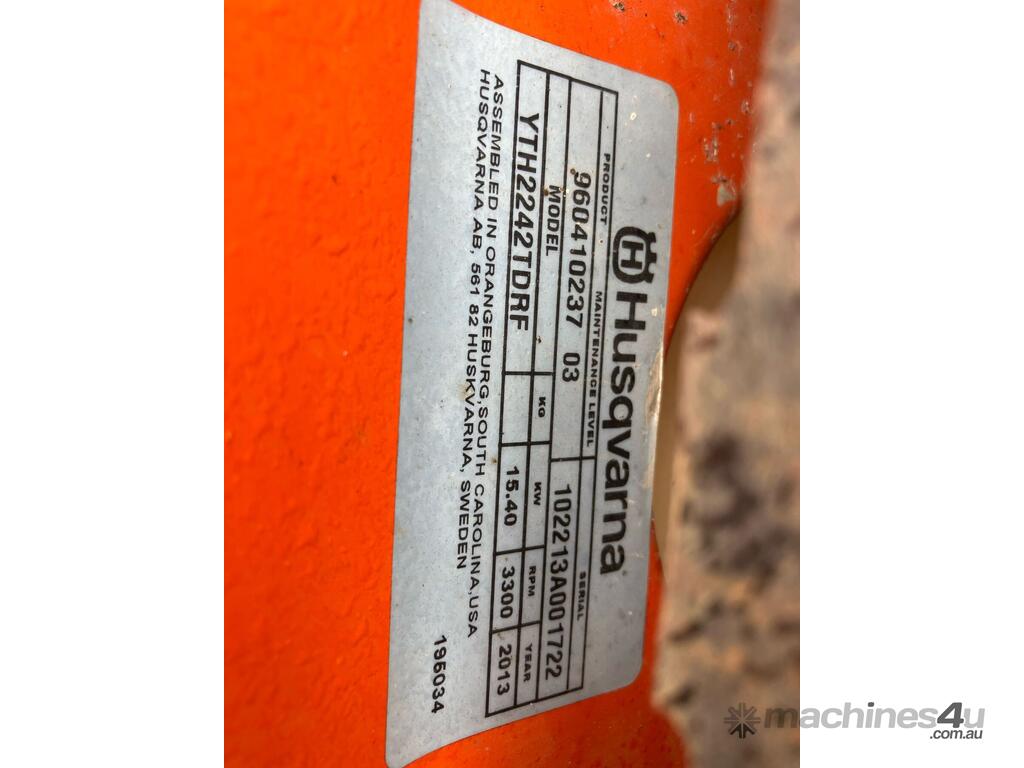 No C/P,Husqvarna,YTH2242TDRF,Ride On Mower,Odometer not visible,508 (Hrs. Showing on Hour meter),Colour: Orange,Unregistered,Serial No: 102213A001722,Sold with No Plates,WOVR Status: WOVR N/A,Incident Type: Not Applicable