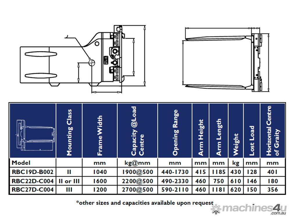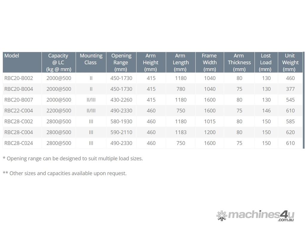 Wide range of bale clamp capacities and options available, with varying arm lengths and opening ranges.