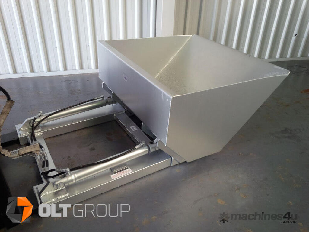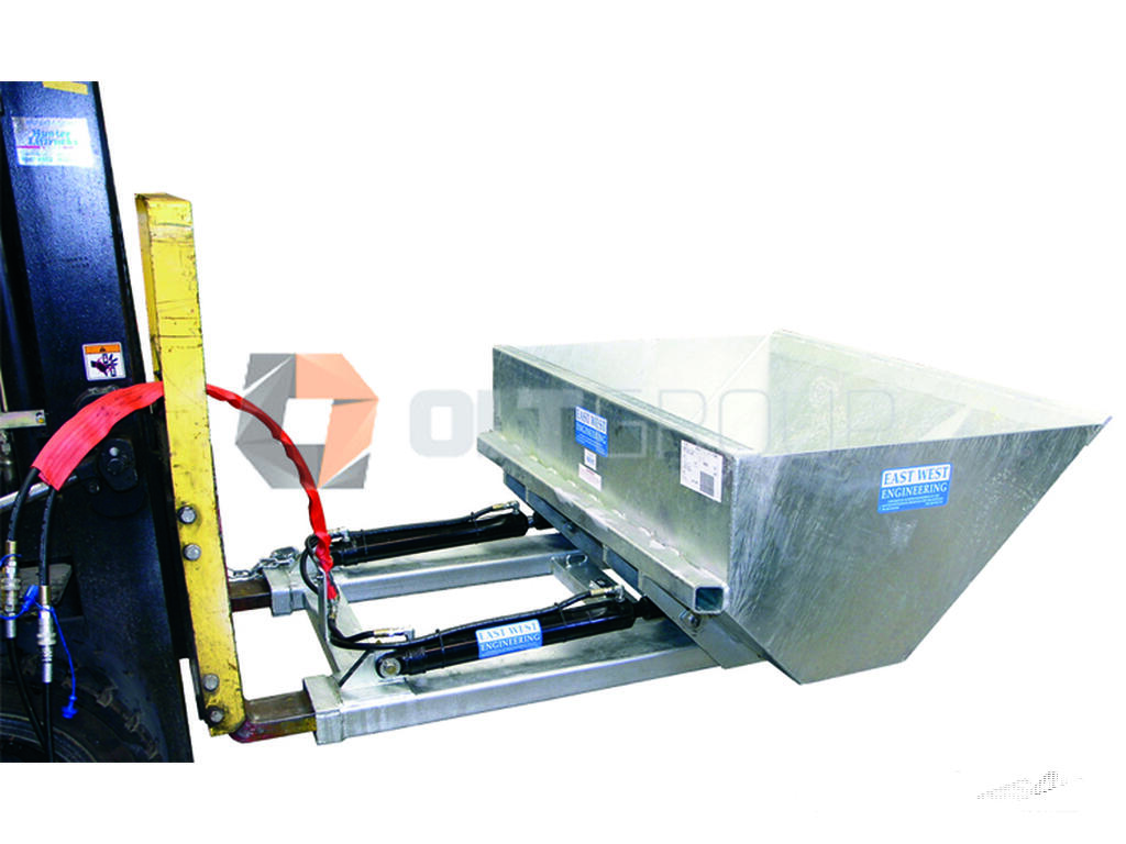 Hydraulic operation allows for full backwards tilt of the bucket, making it suitable for liquid products.