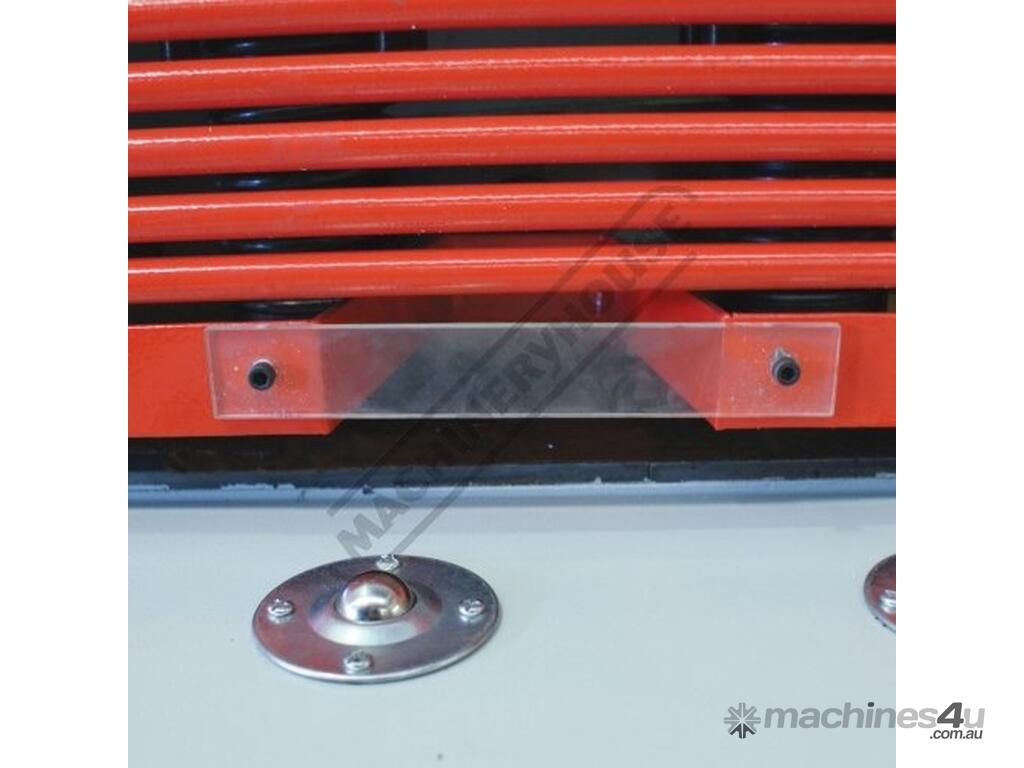 Pneumatic operated material sheet supports mounted to rear of machine. This feature assists in shearing thin material to the correct cut length required simply by preventing thinner material flexing and falling below the backgauge prior to shearing.