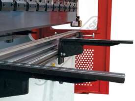 Sliding steel fabricated sheet supports enabling a wide range of material sizes to be aligned and supported at the correct required height. This feature is achieved with a "T" slot machined down the total length of the die bed sheet supports are also adjustable vertically to assist in supporting material with return bends already folded.
