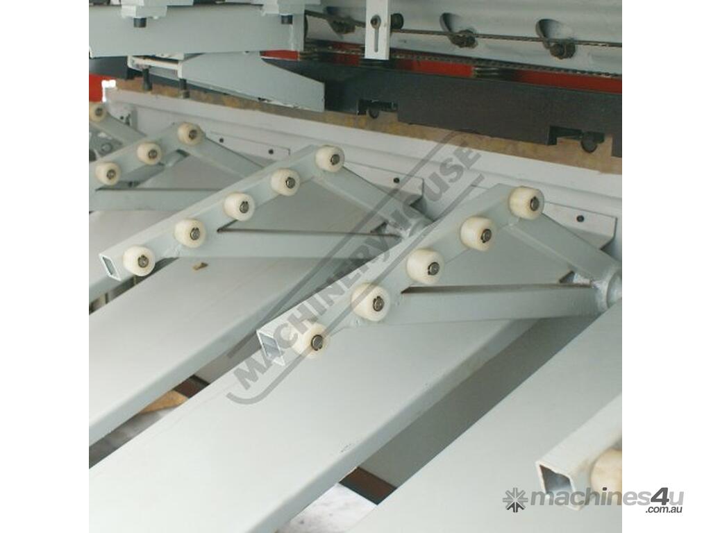 Pneumatic operated material sheet supports mounted to rear of machine.