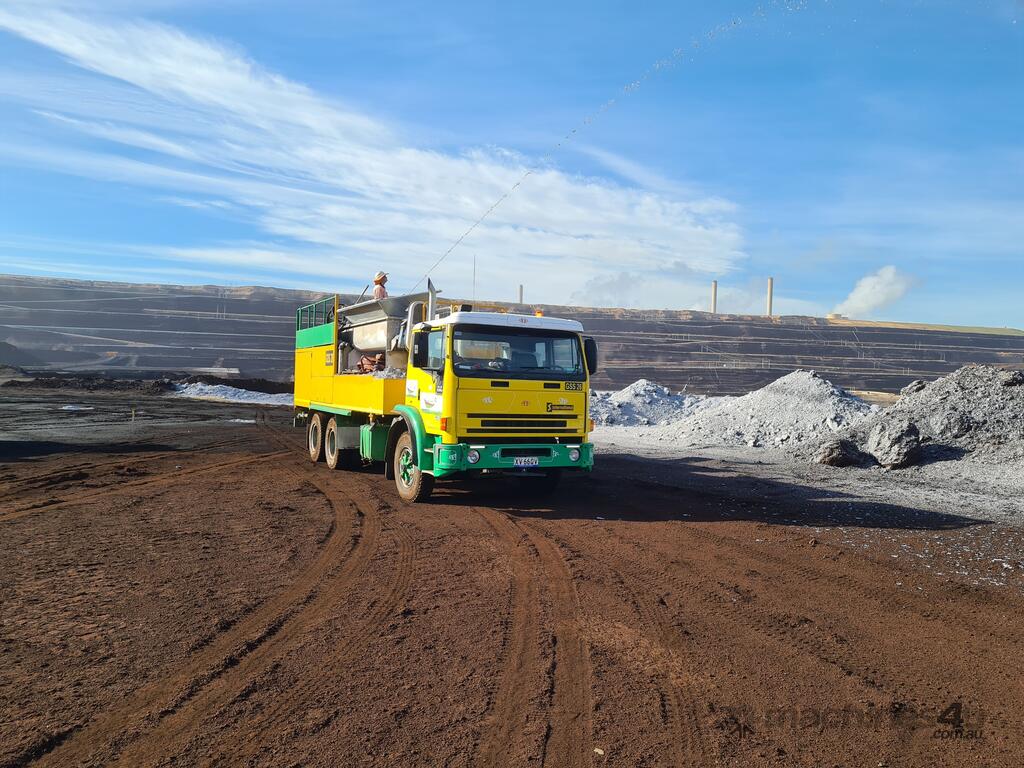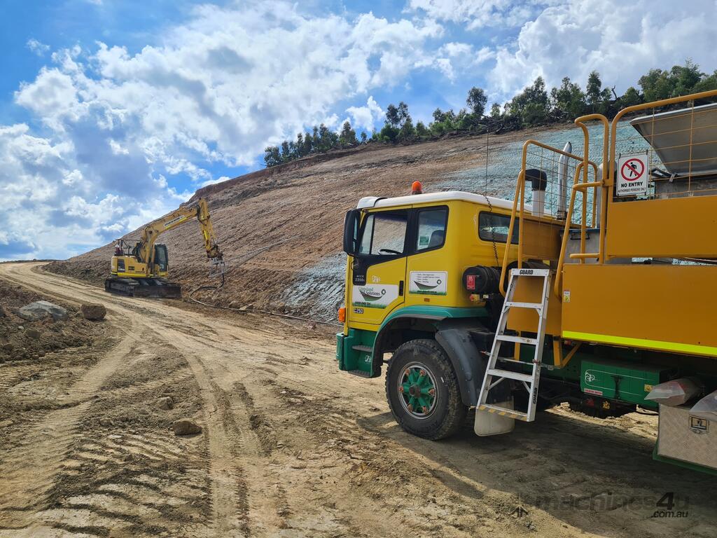 Good unit, ready for work. Unique machine which has the ability to fill loose bulk wood fiber or paper fiber into hopper driven by a hydraulic auger. all functions are hydraulic including pump, auger, paddle, large 4000lt paddle mixing tank, 4200lt water tank, 100's of meters of 3", 2" and 40mm and 32mm hoses, nozzles, monitor, Brigs transfer pump wired to start/stop from top center console. Isuzu motor runs hydraulic pump for all auxiliary functions, plenty of fittings for different hookups, good honest machine make great first buy or just getting into Hydroseeding or mulching, comes with some local work. Inter truck in good condition starts and runs well, auto trans so easy to drive, should have years left in it because it doesn't run that often when hydroseeding only when moving A-B. Plenty of extras, guar gum and a few drums of spray green dye.