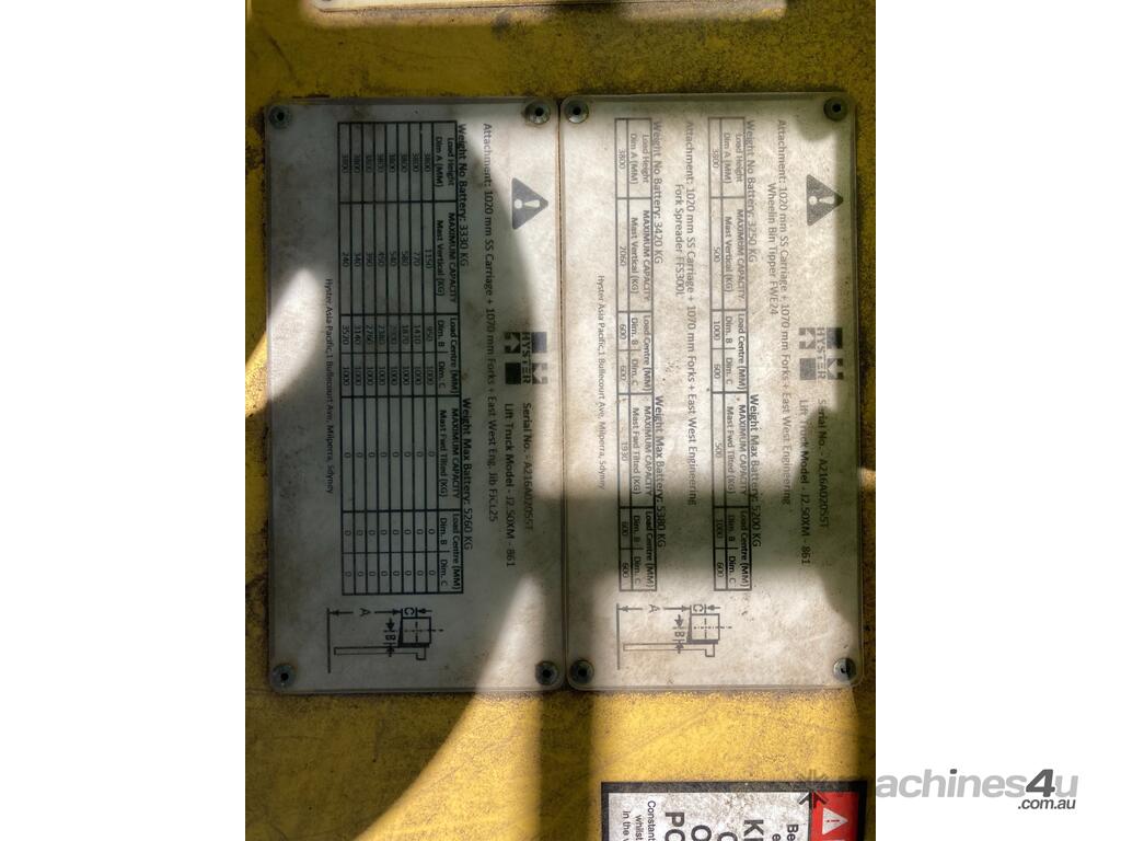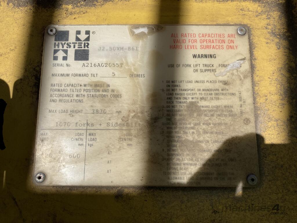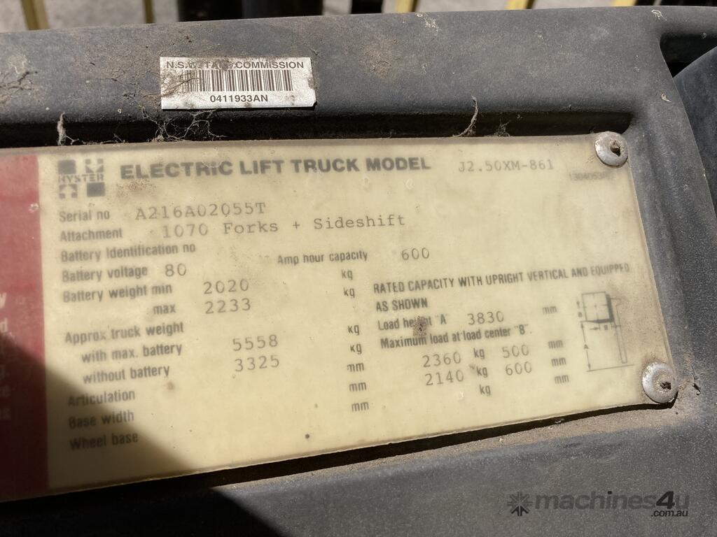 No C/P,Hyster,Counter Balance Forklift,Electric,Odometer not visible,Hourmeter not visible,Colour: Yellow,Unregistered,Serial No: A216A02055T,Sold with No Plates,Key No: No Key