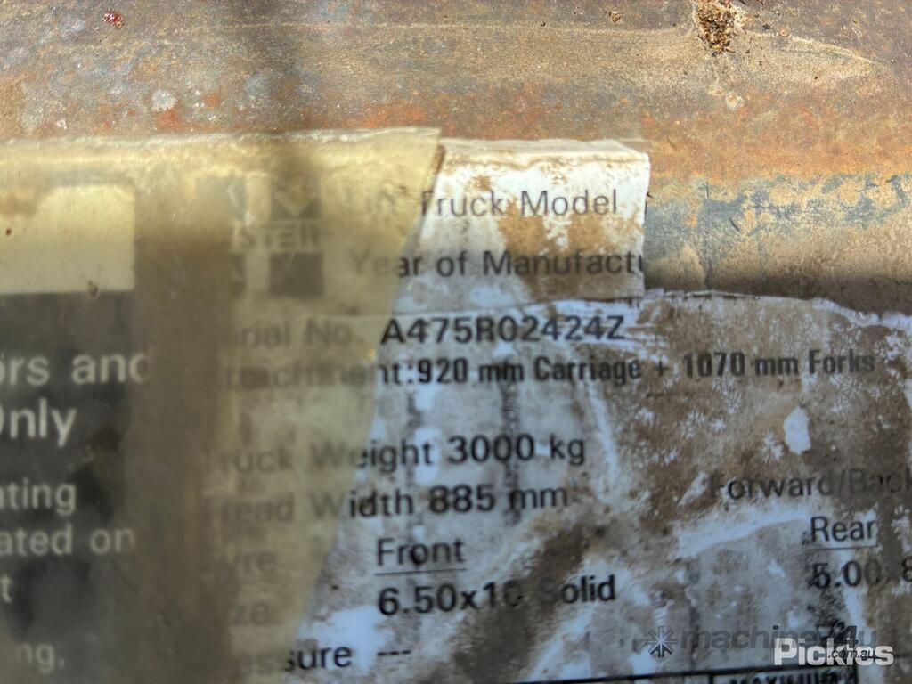 No C/P,Hyster,Forklift,4 Cyl,Diesel,Odometer not visible,11632 (Hrs. Showing on Hour meter),Colour: Yellow,Unregistered,Serial No: A475R02424Z,Sold with No Plates,Key No: 183E