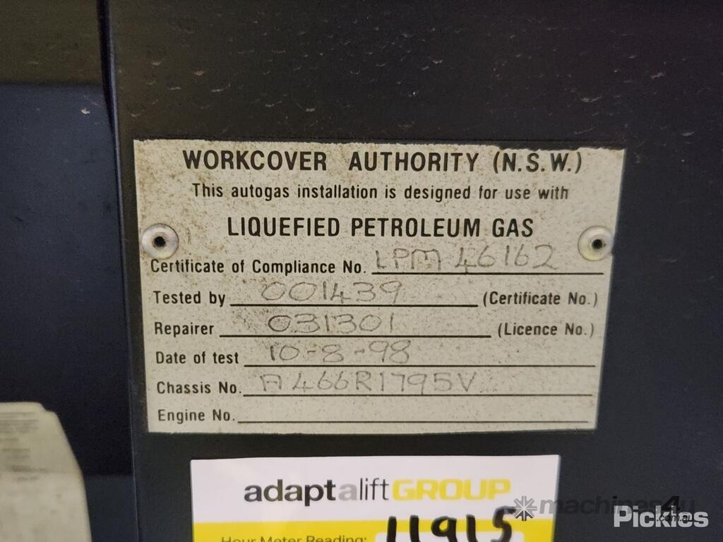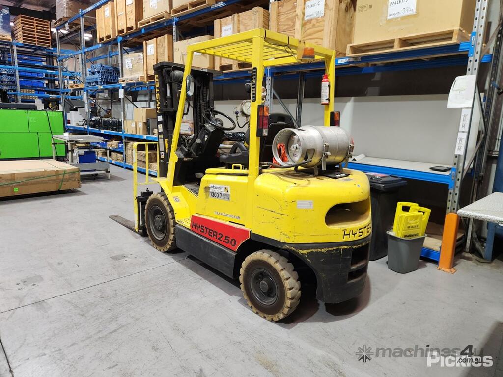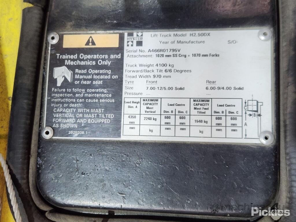No C/P,Hyster,H2.50DX,Counter Balance Forklift,4 Cyl,LPG only,Carburettor,Odometer not visible,11932 (Hrs. Showing on Hour meter),Colour: Yellow,Unregistered,Serial No: A466R01795V,Sold with No Plates